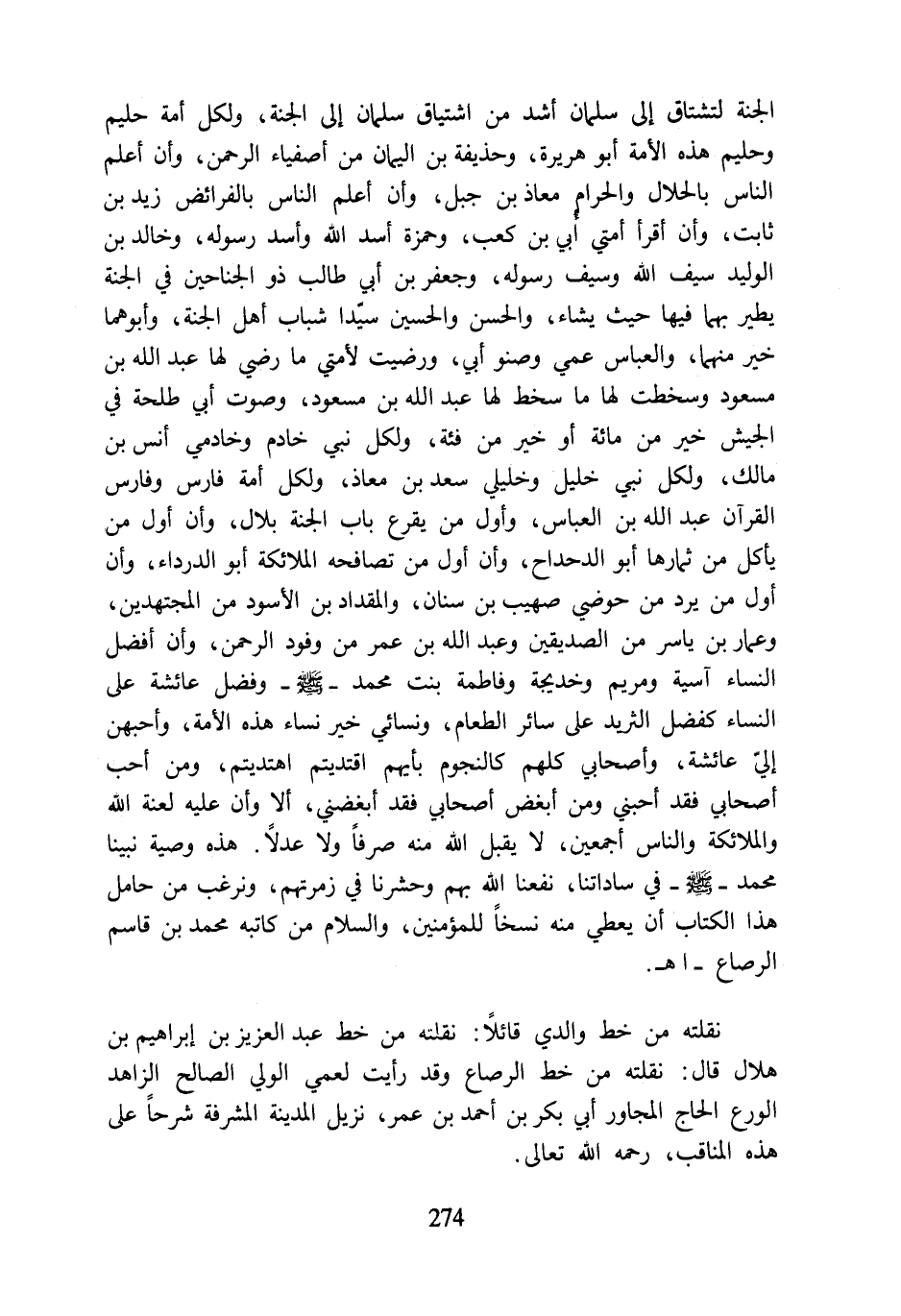 الجنة لتشتاق إلى سلمان أشد من اشتياق سلمان إلى الجنة، ولكل أمة حليم وحليم هذه الأمة أبو هريرة، وحذيفة بن اليمان من أصفياء الرحمن، وأن أعلم الناس بالحلال والحرام معاذ بن جبل، وأن أعلم الناس بالفرائض زيد بن ثابت، وأن أقرأ أمتي أُبي بن كعب، وحمزة أسد اللَّه وأسد رسوله، وخالد بن الوليد سيف اللَّه وسيف رسوله، وجعفر بن أبي طالب ذو الجناحين في الجنة يطير بهما فيها حيث يشاء، والحسن والحسين سيّدا شباب أهل الجنة، وأبوهما خير منهما، والعباس عمي وصنو أبي، ورضيت لأمتي ما رضي لها عبد اللَّه بن مسعود وسخطت لها ما سخط لها عبد اللَّه بن مسعود، وصوت أبي طلحة في الجيش خير من مائة أو خير من فئة، ولكل نبي خادم وخادمي أنس بن مالك، ولكل نبي خليل وخليلي سعد بن معاذ، ولكل أمة فارس وفارس القرآن عبد اللَّه بن العباس، وأول من يقرع باب الجنة بلال، وأن أول من يأكل من ثمارها أبو الدحداح، وأن أول من تصافحه الملائكة أبو الدرداء، وأن أول من يرد من حوضي صهيب بن سنان، والمقداد بن الأسود من المجتهدين، وعمار بن ياسر من الصديقين وعبد اللَّه بن عمر من وفود الرحمن، وأن أفضل النساء آسية ومريم وخديجة وفاطمة بنت محمد -صلى اللَّه عليه وسلم- وفضل عائشة على النساء كفضل الثريد على سائر الطعام، ونسائي خير نساء هذه الأمة، وأحبهن إليّ عائشة، وأصحابي كلهم كالنجوم بأيهم اقتديتم اهتديتم، ومن أحب أصحابي فقد أحبني ومن أبغض أصحابي فقد أبغضني، ألا وأن عليه لعنة اللَّه والملائكة والناس أجمعين، لا يقبل اللَّه منه صرفًا ولا عدلًا. هذه وصية نبينا محمد -صلى اللَّه عليه وسلم- في ساداتنا، نفعنا اللَّه بهم وحشرنا في زمرتهم، ونرغب من حامل هذا الكتاب أن يعطي منه نسخًا للمؤمنين، والسلام من كاتبه محمد بن قاسم الرصاع- اهـ.