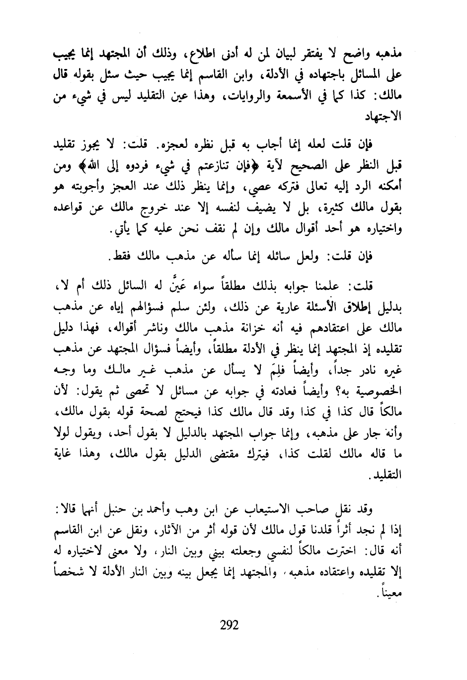قلت: علمنا جوابه بذلك مطلقًا سواء عَينَّ له السائل ذلك أم لا، بدليل إطلاق الأسئلة عارية عن ذلك، ولئن سلم فسؤالهم إياه عن مذهب مالك على اعتقادهم فيه أنه خزانة مذهب مالك وناشر أقواله، فهذا دليل تقليده إذ المجتهد إنما ينظر في الأدلة مطلقًا، وأيضًا فسؤال المجتهد عن مذهب غيره نادر جدًا، وأيضًا فلِمَ لا يسأل عن مذهب غير مالك وما وجه الخصوصية به؟ وأيضًا فعادته في جوابه عن مسائل لا تحصى ثم يقول: لأن مالكًا قال كذا في كذا وقد قال مالك كذا فيحتج لصحة قوله بقول مالك، وأنه جار على مذهبه، وإنما جواب المجتهد بالدليل لا بقول أحد، ويقول لولا ما قاله مالك لقلت كذا، فيترك مقتضى الدليل بقول مالك، وهذا غاية التقليد.