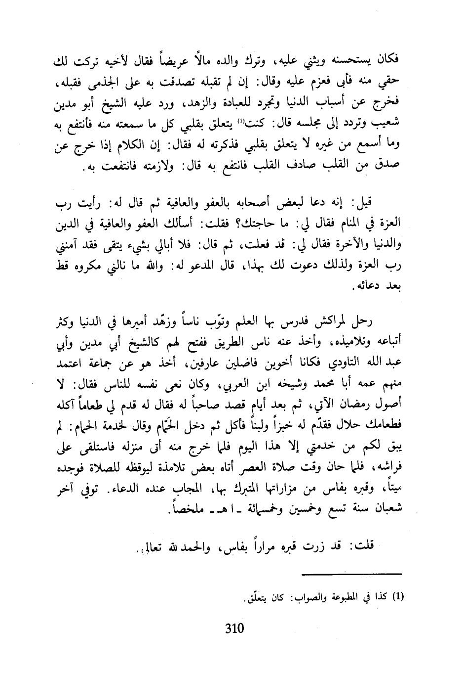 فكان يستحسنه ويثني عليه، وترك والده مالًا عريضًا فقال لأخيه تركت لك حقي منه فأبى فعزم عليه وقال: إن لم تقبله تصدقت به على الجذمى فقبله، فخرج عن أسباب الدنيا وتجرد للعبادة والزهد، ورد عليه الشيخ أبو مدين شعيب وتردد إلى مجلسه قال: كنت (¬1) يتعلق بقلبي كل ما سمعته منه فأنتفع به وما أسمع من غيره لا يتعلق بقلبي فذكرته له فقال: إن الكلام إذا خرج عن صدق من القلب صادف القلب فانتفع به قال: ولازمته فانتفعت به.