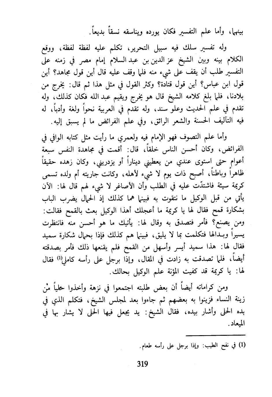 وأما علم التصوف فهو الإمام فيه ولعمري ما رأيت مثل كتابه الوافي في الفرائض، وكان أحسن الناس خلقًا، قال: أقمت في مجاهدة النفس سبعة أعوام حتى استوى عندي من يعطيني دينارًا أو يزدريني، وكان زهده حقيقًا ظاهرًا وباطنًا، أصبح ذات يوم لا شيء لأهله، وكانت جاريته أم ولده تسمى كريمة سيئة فاشتدّت عليه في الطلب وأن الأصاغر لا شيء لهم قال لها: الآن يأتي من قبل الوكيل ما نتقوت به فبينما هما كذلك إذ الحمال يضرب الباب بشكارة قمح فقال لها يا كريمة ما أعجلك أهذا الوكيل بعث بالقمح فقالت: ومن يصنع؟ فأمر فتصدق به وقال لها: يأتيك ما هو أحسن منه فانتظرت يسيرًا وبدالها فتكلمت بما لا يليق، فبينما هم كذلك فإذا بحمال شكارة سميد فقال لها: هذا سميد أيسر وأسهل من القمح فلم يقنعها ذلك فأمر بصدقته أيضًا، فلما تصدقت به زادت في المقال، وإذا برجل على رأسه كاملي (¬1) فقال لها: يا كريمة قد كفيت المؤنة علم الوكيل بحالك.