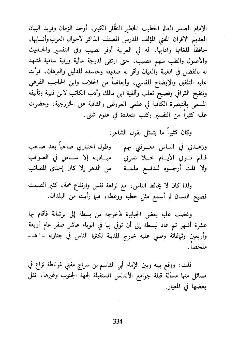 الإمام الصدر العالم الخطيب الخطير النظّار الكبير، أوحد الزمان وفريد البيان العديم الاقران المفتي المؤلف المدرس المصنف الذاكر لأحوال العرب وأنسابها، حافظًا للغاتها وآدابها، له في العربية أوفر نصيب وفي التفسير والحديث والأصول والطب سهم مصيب، حتى ارتقى لدرجة عالية ورتبة سامية فشهد له بالفضل في الغيبة والعيان وأقر له صديقه وحاسده للدليل والبرهان، قرأت عليه التلقين والإيضاح للفاسي، وأبعاضًا من الجلاب وابن الحاجب الفرعي وتنقيح القرافي وفصيح ثعلب وألفية ابن مالك وأدب الكاتب لابن قتيبة وتأليفه المسمى بالتبصرة الكافية في علمي العروض والقافية على الخزرجية، وحضرت عليه كثيرًا من التفسير وكتب متعددة في علوم شتى.