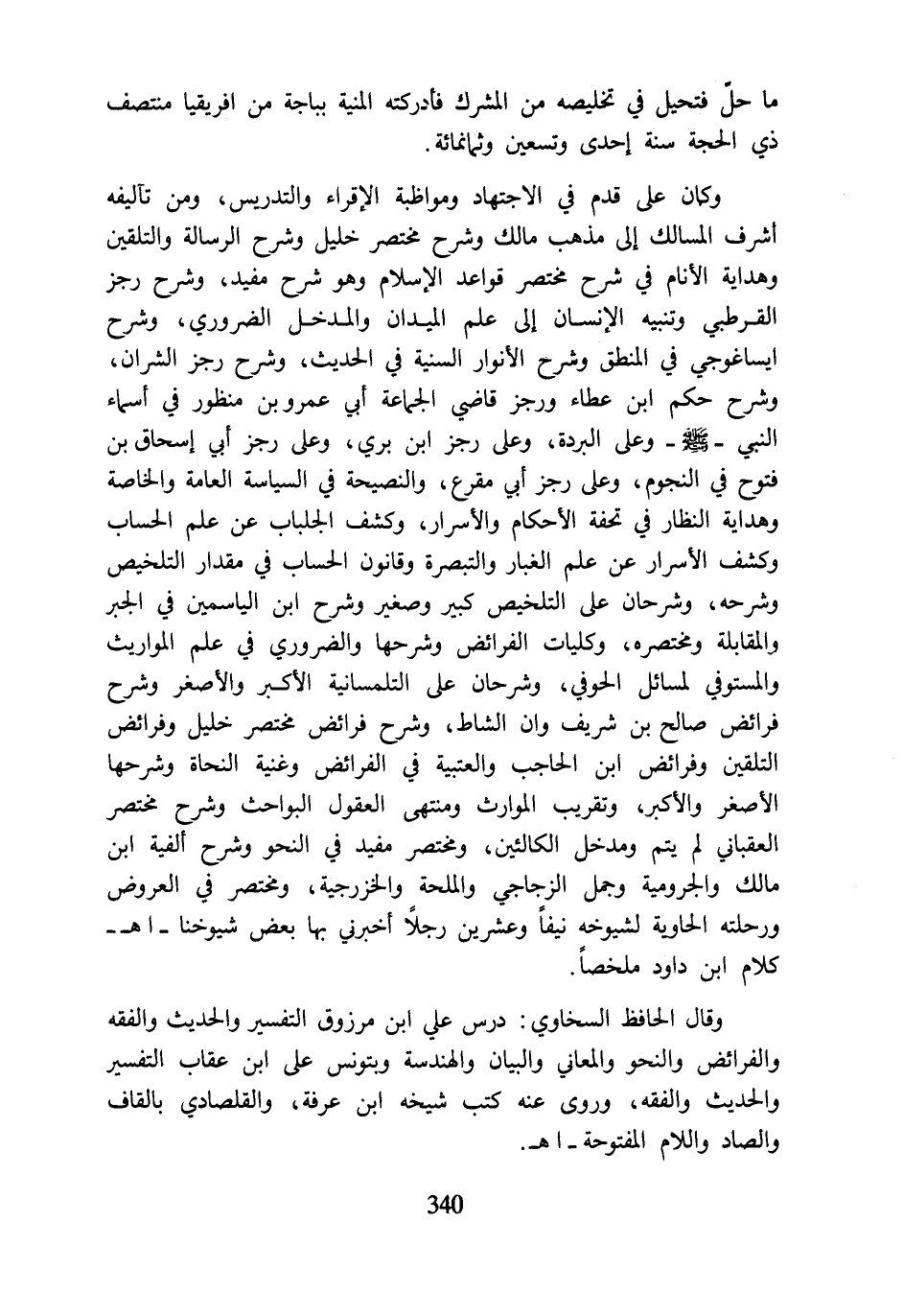 وقال الحافظ السخاوي: درس علي ابن مرزوق التفسير والحديث والفقه والفرائض والنحو والمعاني والبيان والهندسة وبتونس على ابن عقاب التفسير والحديث والفقه، وروى عنه كتب شيخه ابن عرفة، والقلصادي بالقاف والصاد واللام المفتوحة- اهـ.