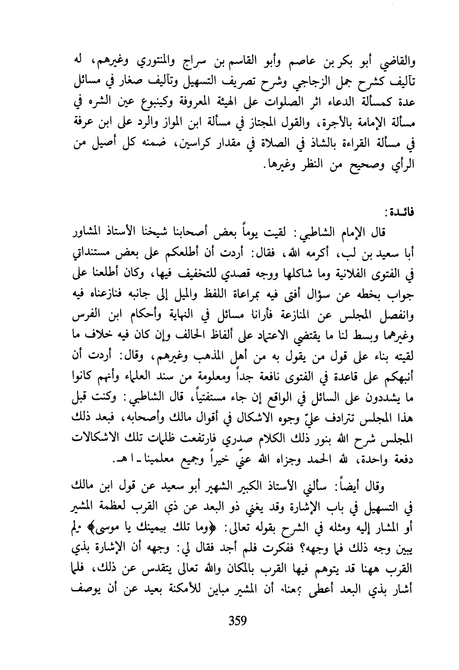 وقال أيضًا: سألني الأستاذ الكبير الشهير أبو سعيد عن قول ابن مالك في التسهيل في باب الإشارة وقد يغني ذو البعد عن ذي القرب لعظمة المشير أو المشار إليه ومثله في الشرح بقوله تعالى: {وَمَا تِلْكَ بِيَمِينِكَ يَامُوسَى} ولم يبين وجه ذلك فما وجهه؟ ففكرت فلم أجد فقال لي: وجهه أن الإشارة بذي القرب ههنا قد يتوهم فيها القرب بالمكان واللَّه تعالى يتقدس عن ذلك، فلما أشار بذي البعد أعطى بمعناه أن المشير مباين للأمكنة بعيد عن أن يوصف