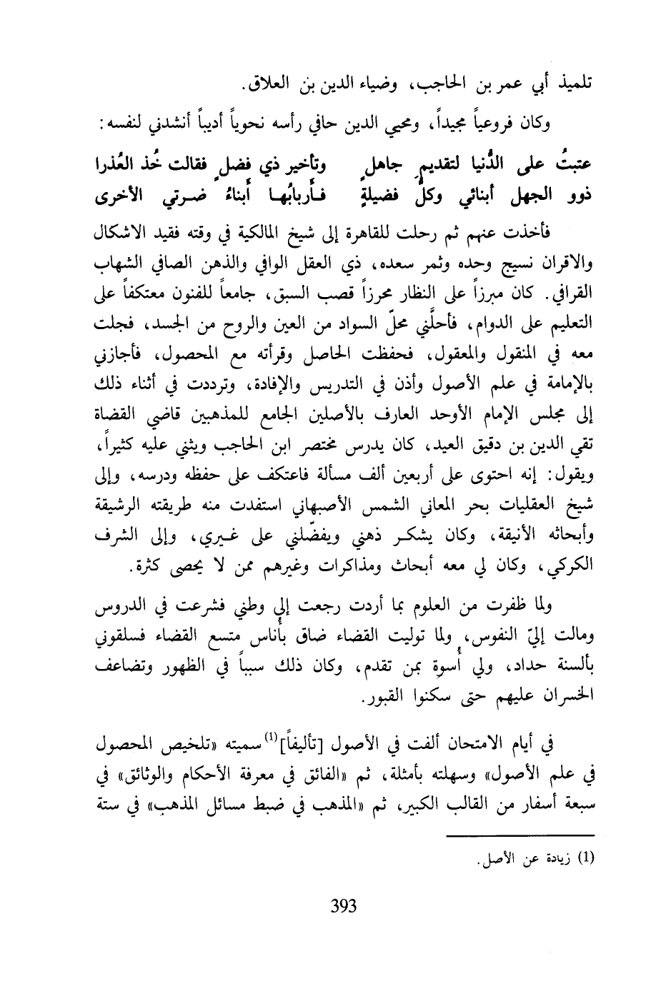 فأخذت عنهم ثم رحلت للقاهرة إلى شيخ المالكية في وقته فقيد الاشكال والاقران نسيج وحده وثمر سعده، ذي العقل الوافي والذهن الصافي الشهاب القرافي. كان مبرزًا على النظار محرزًا قصب السبق، جامعًا للفنون معتكفًا على التعليم على الدوام، فأحلَّني محلّ السواد من العين والروح من الجسد، فجلت معه في المنقول والمعقول، فحفظت الحاصل وقرأته مع المحصول، فأجازني بالإمامة في علم الأصول وأذن في التدريس والإفادة، وترددت في أثناء ذلك إلى مجلس الإمام الأوحد العارف بالأصلين الجامع للمذهبين قاضي القضاة تقي الدين بن دقيق العيد، كان يدرس مختصر ابن الحاجب ويثني عليه كثيرًا، ويقول: إنه احتوى على أربعين ألف مسألة فاعتكف على حفظه ودرسه، وإلى شيخ العقليات بحر المعاني الشمس الأصبهاني استفدت منه طريقته الرشيقة وأبحاثه الأنيقة، وكان يشكر ذهني ويفضّلني على غيري، وإلى الشرف الكركي، وكان لي معه أبحاث ومذاكرات وغيرهم ممن لا يحصى كثرة.