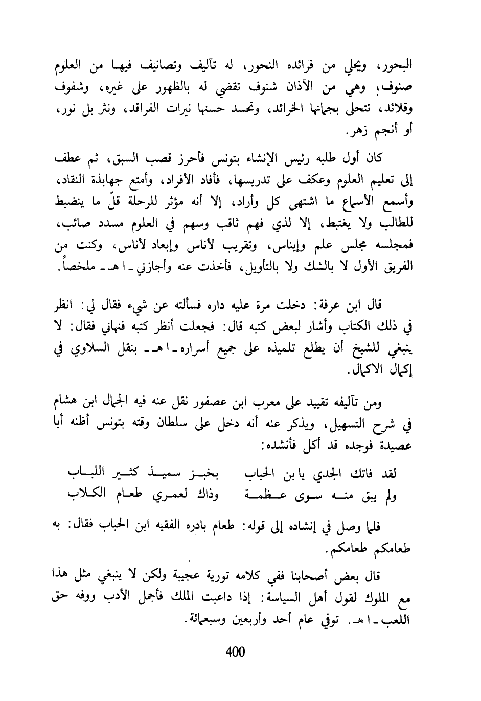 قال بعض أصحابنا ففي كلامه تورية عجيبة ولكن لا ينبغي مثل هذا مع الملوك لقول أهل السياسة: إذا داعبت الملك فأجمل الأدب ووفه حق اللعب- اهـ. توفي عام أحد وأربعين وسبعمائة.