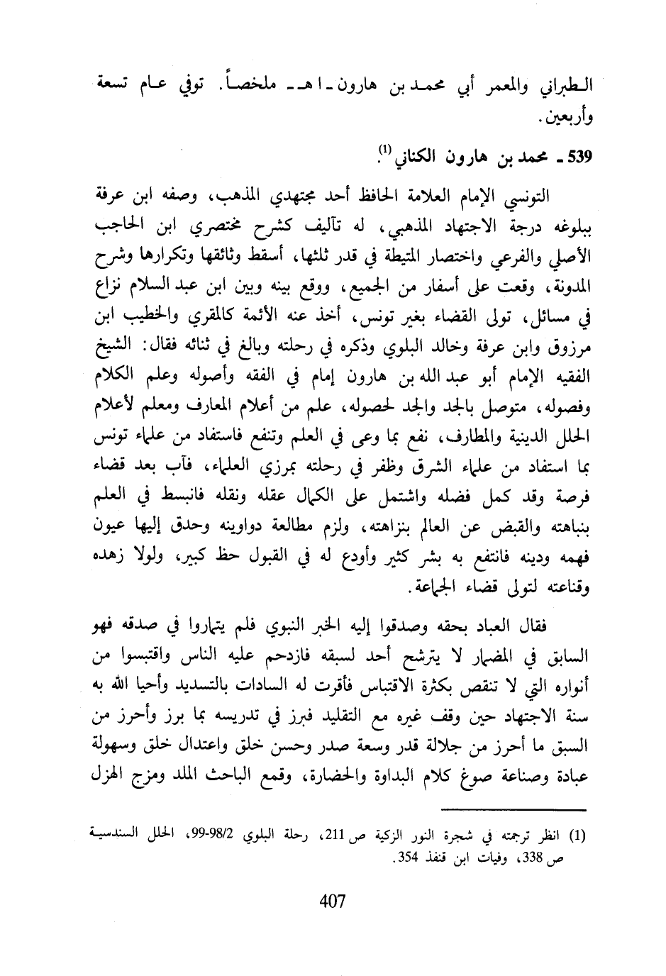 التونسي الإمام العلامة الحافظ أحد مجتهدي المذهب، وصفه ابن عرفة ببلوغه درجة الاجتهاد المذهبي، له تآليف كشرح مختصري ابن الحاجب الأصلي والفرعي واختصار المتيطة في قدر ثلثها، أسقط وثائقها وتكرارها وشرح المدونة، وقعت على أسفار من الجميع، ووقع بينه وبين ابن عبد السلام نزاع في مسائل، تولى القضاء بغير تونس، أخذ عنه الأئمة كالمقري والخطيب ابن مرزوق وابن عرفة وخالد البلوي وذكره في رحلته وبالغ في ثنائه فقال: الشيخ الفقيه الإمام أبو عبد اللَّه بن هارون إمام في الفقه وأصوله وعلم الكلام وفصوله، متوصل بالجد والجد لحصوله، علم من أعلام العارف ومعلم لأعلام الحلل الدينية والمطارف، نفع بما وعى في العلم وتنفع فاستفاد من علماء تونس بما استفاد من علماء الشرق وظفر في رحلته بمرزي العلماء، فآب بعد قضاء فرصة وقد كمل فضله واشتمل على الكمال عقله ونقله فانبسط في العلم بنباهته والقبض عن العالم بنزاهته، ولزم مطالعة دواوينه وحدق إليها عيون فهمه ودينه فانتفع به بشر كثير وأودع له في القبول حظ كبير، ولولا زهده وقناعته لتولى قضاء الجماعة.