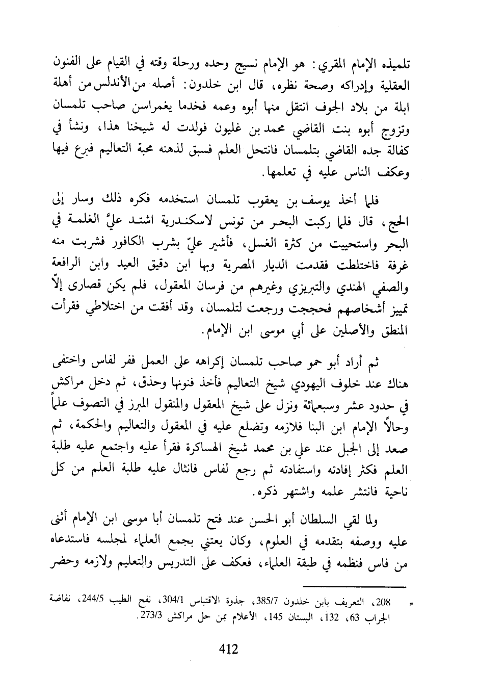 = 208، التعريف بابن خلدون 5/ 385، جذوة الاقتباس 5/ 244، نفح الطيب 5/ 244، نفاضة الجراب 63، 132، البستان 145، الأعلام بمن حل مراكش 3/ 273.