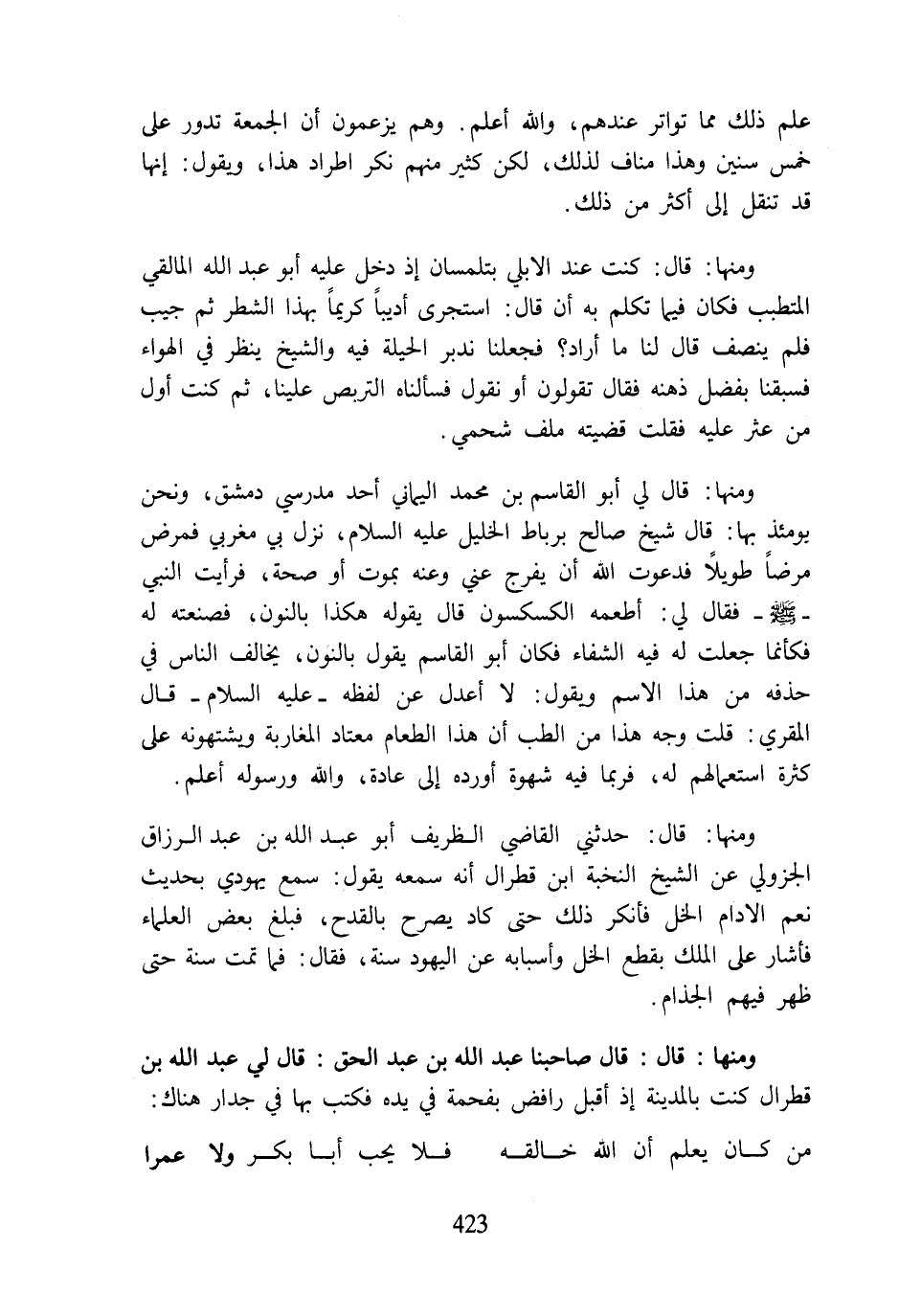 ومنها: قال: كنت عند الابلي بتلمسان إذ دخل عليه أبو عبد اللَّه المالقي المتطبب فكان فيما تكلم به أن قال: استجرى أديبًا كريمًا بهذا الشطر ثم جيب فلم ينصف قال لنا ما أراد؟ فجعلنا ندبر الحيلة فيه والشيخ ينظر في الهواء فسبقنا بفضل ذهنه فقال تقولون أو نقول فسألناه التربص علينا، ثم كنت أول من عثر عليه فقلت قضيته ملف شحمي.