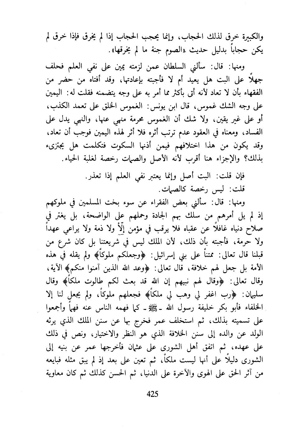 ومنها: قال: سألني بعض الفقراء عن سوء بخت المسلمين في ملوكهم إذ لم يل أمرهم من سلك بهم الجادة وحملهم على الواضحة، بل يغتر في صلاح دنياه غافلًا عن عقباه فلا يرقب في مؤمن إلّا ولا ذمة ولا يراعي عهدًا ولا حرمة، فأجبته بأن ذلك، لأن الملك ليس في شريعتنا بل كان شرع من قبلنا قال تعالى: ممتنًا على بني إسرائيل: {وَجَعَلَكُمْ مُلُوكًا} ولم يقله في هذه الأمة بل جعل لهم خلافة، قال تعالى: {وَعَدَ اللَّهُ الَّذِينَ آمَنُوا مِنْكُمْ} الآية، وقال تعالى: {وَقَالَ لَهُمْ نَبِيُّهُمْ إِنَّ اللَّهَ قَدْ بَعَثَ لَكُمْ طَالُوتَ مَلِكًا} وقال سليمان: {رَبِّ اغْفِرْ لِي وَهَبْ لِي مُلْكًا} فجعلهم ملوكًا، ولم يجعل لنا إلا الخلفاء فأبو بكر خليفة رسول اللَّه -صلى اللَّه عليه وسلم- كما فهمه الناس عنه فهمًا وأجمعوا على تسميته بذلك، ثم استخلف عمر فخرج بها عن سنن الملك الذي يرثه الولد عن والده إلى سنن الخلافة الذي هو النظر والاختيار، ونص في ذلك على عهده، ثم اتفق أهل الشورى على عثمان فأخرجها عمر عن بنيه إلى الشورى دليلًا على أنها ليست ملكًا، ثم تعين على بعد إذ لم يبق مثله فبايعه من آثر الحق على الهوى والآخرة على الدنيا، ثم الحسن كذلك ثم كان معاوية