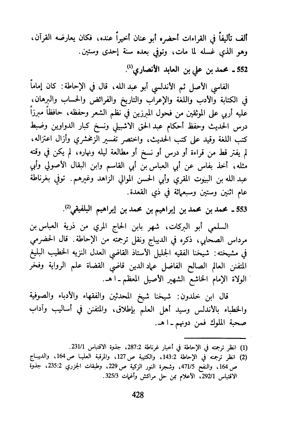 (¬2) انظر ترجمته في الإحاطة 2: 143، والكتيبة ص 127، والمرقبة العليا ص 164، والديباج ص 164، والنفح 5/ 471، وشجرة النور الزكية ص 229، وطبقات الجزري 2: 235، جذوة الاقتباس 1/ 292، الأعلام بمن حل مراكش وأغمات 3/ 325.