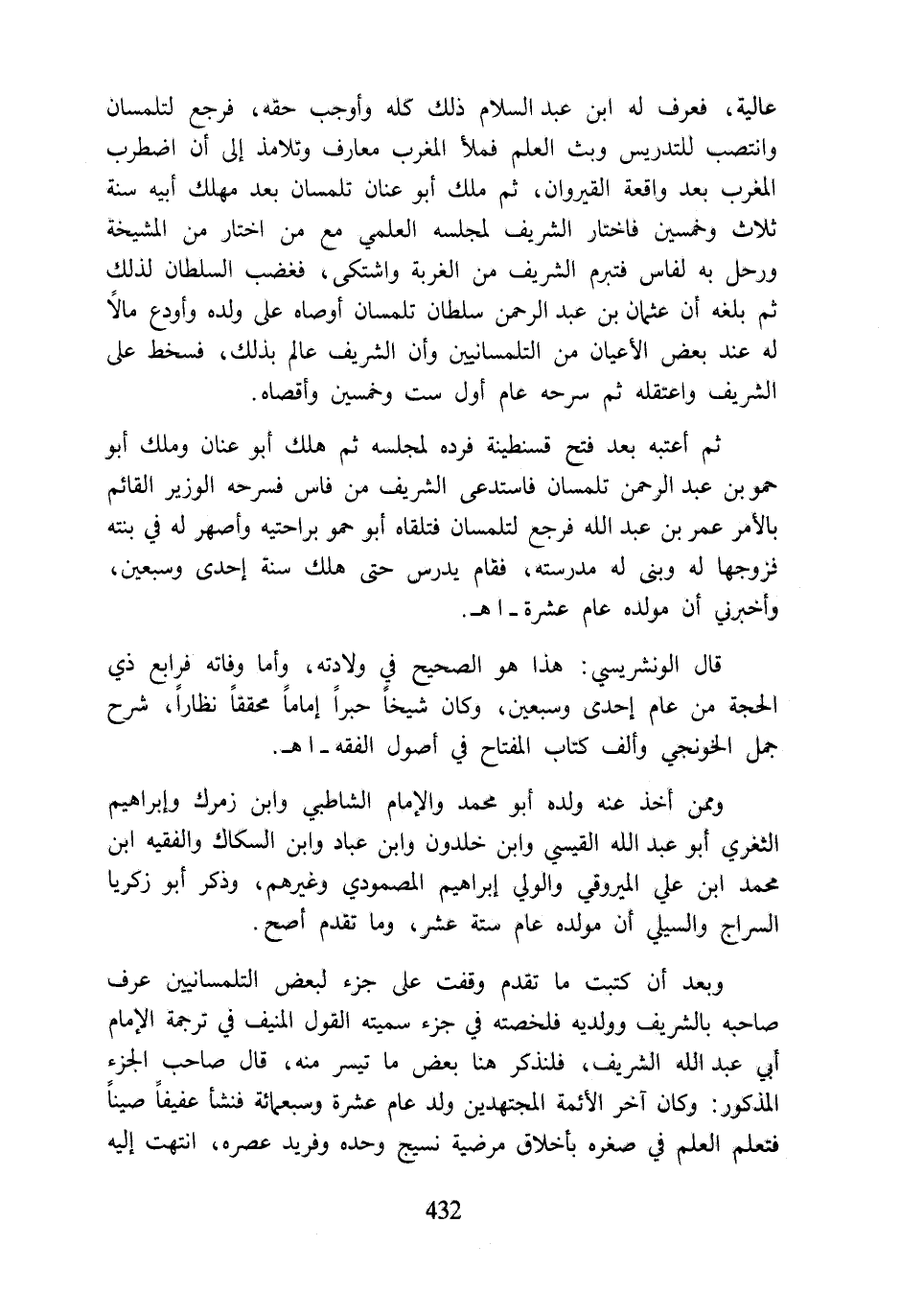 ثم أعتبه بعد فتح قسنطينة فرده لمجلسه ثم هلك أبو عنان وملك أبو حمو بن عبد الرحمن تلمسان فاستدعى الشريف من فاس فسرحه الوزير القائم بالأمر عمر بن عبد اللَّه فرجع لتلمسان فتلقاه أبو حمو براحتيه وأصهر له في بنته فزوجها له وبنى له مدرسته، فقام يدرس حتى هلك سنة إحدى وسبعين، وأخبرني أن مولده عام عشرة- اهـ.