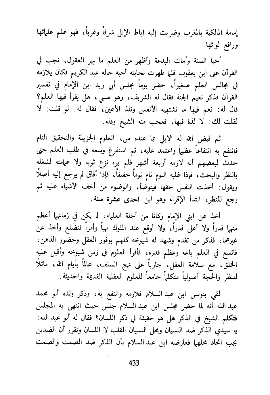 أخذ عن ابني الإمام وكانا من أجلة العلماء، لم يكن في زمانهما أعظم منهما قدرًا ولا أعلى قدرًا، ولا أوقع عند الملوك نهيًا وأمرًا فتضلع وأخذ عن غيرهما، فذكر من تقدم وشهد له شيوخه كلهم بوفور العقل وحضور الذهن، فاتسع في العلم باعه وعظم قدره، فأقرأ العلوم في زمن شيوخه وأقبل عليه الخلق، مع سلامة العقل، جاريًا على نهج السلف، عالمًا بأيام اللَّه، مائلًا للنظر والحجة أصوليًا متكلمًا جامعًا للعلوم العقلية القديمة والحديثة.
