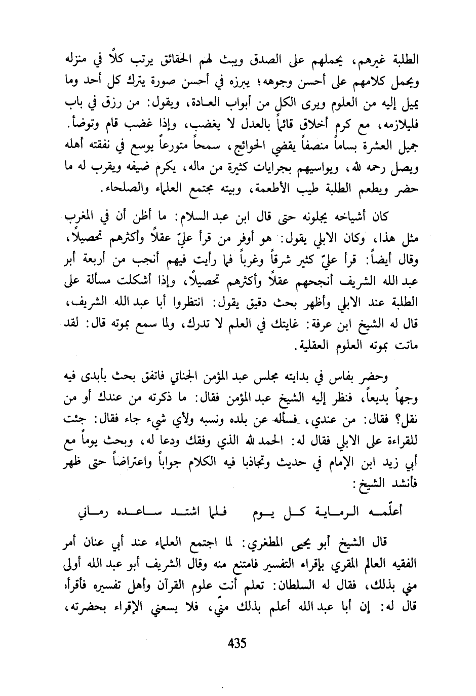 الطلبة غيرهم، يحملهم على الصدق ويبث لهم الحقائق يرتب كلًا في منزله ويحمل كلامهم على أحسن وجوهه؛ يبرزه في أحسن صورة يترك كل أحد وما يميل إليه من العلوم ويرى الكل من أبواب العادة، ويقول: من رزق في باب فليلازمه، مع كرم أخلاق قائمًا بالعدل لا يغضب، وإذا غضب قام وتوضأ. جميل العشرة بسامًا منصفًا يقضي الحوائج، سمحًا متورعًا يوسع في نفقته أهله ويصل رحمه للَّه، ويواسيهم بجرايات كثيرة من ماله، يكرم ضيفه ويقرب له ما حضر ويطعم الطلبة طيب الأطعمة، وبيته مجتمع العلماء والصلحاء.