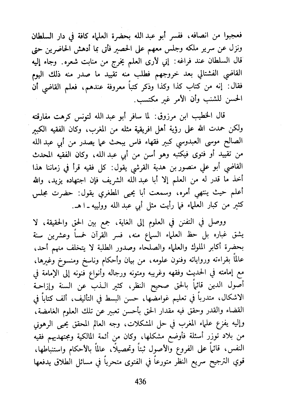 فعجبوا من انصافه، ففسر أبو عبد اللَّه بحضرة العلماء كافة في دار السلطان ونزل عن سرير ملكه وجلس معهم على الحصير فأتى بما أدهش الحاضرين حتى قال السلطان عند فراغه: إني لأرى العلم يخرج من منابت شعره. وجاء إليه القاضي الفشتالي بعد خروجهم فطلب منه تقييد ما صدر منه ذلك اليوم فقال: إنه من كتاب كذا وكذا وذكر كتبًا معروفة عندهم، فعلم القاضي أن الحسن للشنب وأن الأمر غير مكتسب.
