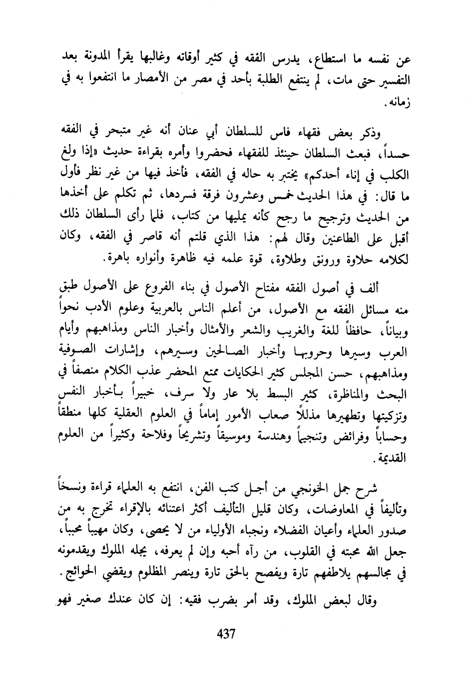 ألف في أصول الفقه مفتاح الأصول في بناء الفروع على الأصول طبق منه مسائل الفقه مع الأصول، من أعلم الناس بالعربية وعلوم الأدب نحوًا وبيانًا، حافظًا للغة والغريب والشعر والأمثال وأخبار الناس ومذاهبهم وأيام العرب وسيرها وحروبها وأخبار الصالحين وسيرهم، وإشارات الصوفية ومذاهبهم، حسن المجلس كثير الحكايات ممتع المحضر عذب الكلام منصفًا في البحث والمناظرة، كثير البسط بلا عار ولا سرف، خبيرًا بأخبار النفس وتزكيتها وتطهيرها مذللًا صعاب الأمور إمامًا في العلوم العقلية كلها منطقًا وحسابًا وفرائض وتنجيمًا وهندسة وموسيقًا وتشريحًا وفلاحة وكثيرًا من العلوم القديمة.