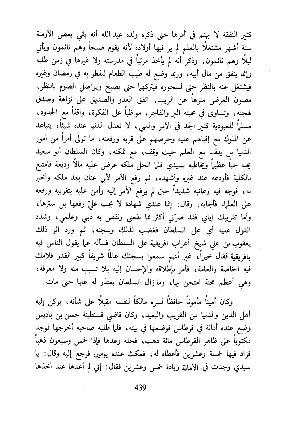 كثير النفقة لا يهتم في أمرها حتى ذكره ولده عبد اللَّه أنه بقي بعض الأزمنة ستة أشهر مشتغلًا بالعلم لم ير فيها أولاده لأنه يقوم صبحًا وهم نائمون ويأتي ليلًا وهم نائمون، وذكر أنه لم يأخذ مرتبًا في مدرسته ولا غيرها في زمن طلبه وإنما ينفق من مال أبيه، وربما وضع له طيب الطعام ليفطر به في رمضان وغيره فيشتغل عنه بالنظر حتى لسحوره فيتركهما حتى يصبح ويواصل الصوم بالنظر، مصون العرض منزهًا عن الريب، اتفق العدو والصديق على نزاهة وصدق لهجته، وتساوى في محبته البر والفاجر، مواظبًا على الفكرة، واقفًا مع الحدود، مسلمًا للعبودية كثير الجد في الأمر والنهي، لا تعدل الدنيا عنده شيئًا، يتباعد عن الملوك مع إقبالهم عليه وحرصهم على قربه ورفعته، ما تولى أمرًا من أمور الدنيا بل يقف مع العلم حيث وقف، مع تمكنه، وكان السلطان أبو سعيد يحبه حبًا عظيمًا ويخاطبه بسيدي فلما انحل ملكه عرض عليه مالًا وديعة فامتنع بالكلية فأودعه عند غيره وأشهده، ثم رفع الأمر لأبي عنان بعد ملكه وأخبر به، فوجه فيه وعاتبه شديدًا حين لم يرفع الأمر إليه وأمن عليه بتقريبه ورفعه على العلماء فأجابه، وقال: إنما عندي شهادة لا يجب عليّ رفعها بل سترها، وأما تقريبك إياي فقد ضرّني أكثر مما نفعني ونقص به ديني وعلمي، وشدد القول عليه أي على السلطان فغضب لذلك وسجنه، ثم ورد اثر ذلك يعقوب بن علي شيخ أعراب افريقية على السلطان فسأله عما يقول الناس فيه بافريقية فقال خيرًا، غير أنهم سمعوا بسجنك عالمًا شريفًا كبير القدر فلامك فيه الخاصة والعامة، فأمر بإطلاقه والإحسان إليه بلا تسبب منه ولا معرفة، وهي أعظم محنة امتحن بها، ومازال السلطان يعتذر له عنها حتى مات.
