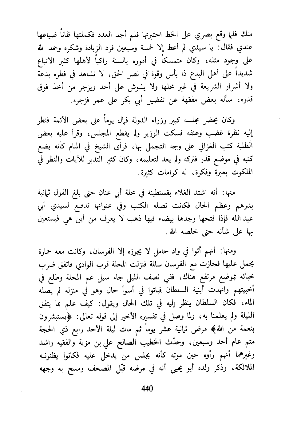 ومنها: أنهم أتوا في واد حامل لا يجوزه إلا الفرسان، وكانت معه حمارة يحمل عليها فجازت مع الفرسان سالمة فنزلت المحلة قرب الوادي فاتفق ضرب خبائه بموضع مرتفع هناك، ففي نصف الليل جاء سيل عم المحلة وطلع في أخبيتهم وانهدت أبنية السهلطان فباتوا في أسوأ حال وهو في منزله لم يصله الماء، فكان السلطان ينظر إليه في تلك الحال ويقول: كيف علم بما يتفق الليلة ولم يعلمنا به، ولما وصل في تفسيره الأخير إلى قوله تعالى: {يَسْتَبْشِرُونَ بِنِعْمَةٍ مِنَ اللَّهِ} مرض ثمانية عشر يومًا ثم مات ليلة الأحد رابع ذي الحجة متم عام أحد وسبعين، وحدّث الخطيب الصالح علي بن مزية والفقيه راشد وغيرهما أنهم رأوه حين موته كأنه يجلس من يدخل عليه فكانوا يظنونه الملائكة، وذكر ولده أبو يحيى أنه في مرضه قبّل المصحف ومسح به وجهه