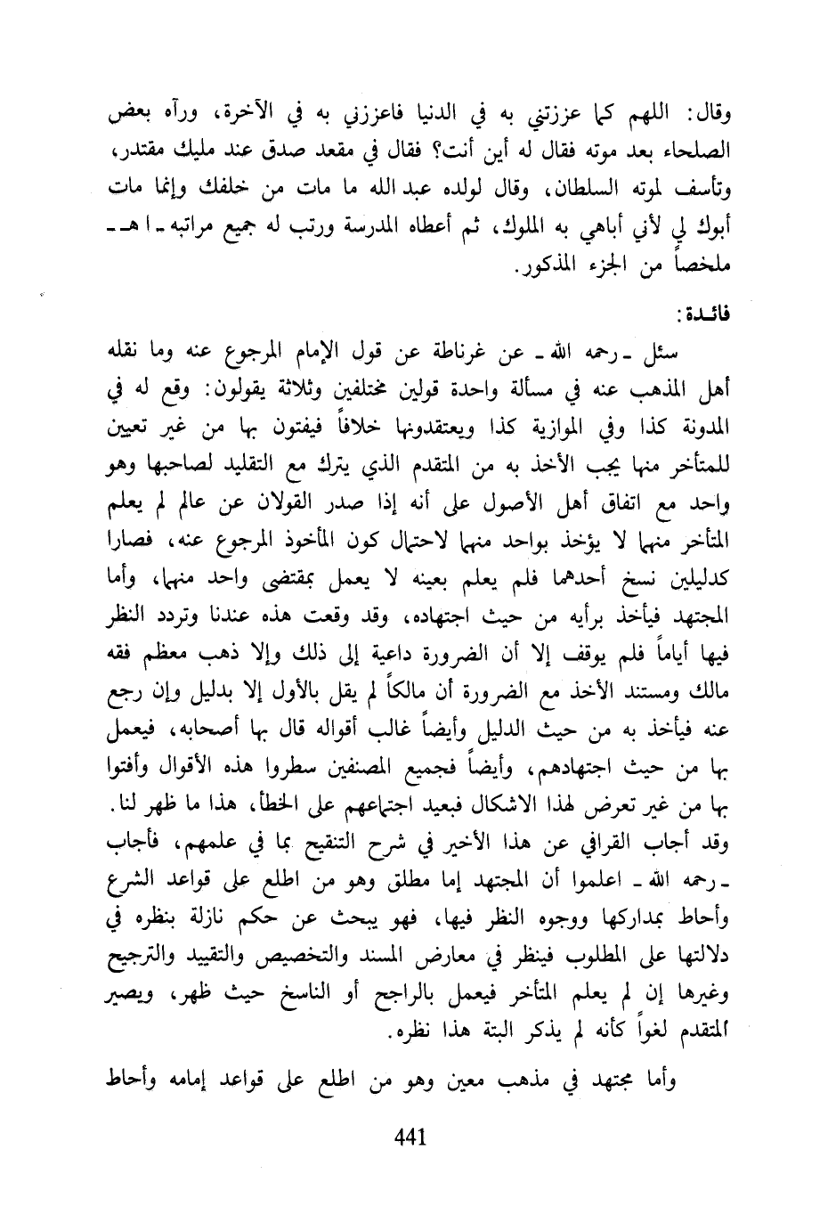 سئل -رحمه اللَّه- عن غرناطة عن قول الإمام المرجوع عنه وما نقله أهل المذهب عنه في مسألة واحدة قولين مختلفين وثلاثة يقولون: وقع له في المدونة كذا وفي الموازية كذا ويعتقدونها خلافًا فيفتون بها من غير تعيين للمتأخر منها يجب الأخذ به من المتقدم الذي يترك مع التقليد لصاحبها وهو واحد مع اتفاق أهل الأصول على أنه إذا صدر القولان عن عالم لم يعلم المتأخر منهما لا يؤخذ بواحد منهما لاحتمال كون المأخوذ المرجوع عنه، فصارا كدليلين نسخ أحدهما فلم يعلم بعينه لا يعمل بمقتضى واحد منهما، وأما المجتهد فيأخذ برأيه من حيث اجتهاده، وقد وقعت هذه عندنا وتردد النظر فيها أيامًا فلم يوقف إلا أن الضرورة داعية إلى ذلك وإلا ذهب معظم فقه مالك ومستند الأخذ مع الضرورة أن مالكًا لم يقل بالأول إلا بدليل وإن رجع عنه فيأخذ به من حيث الدليل وأيضًا غالب أقواله قال بها أصحابه، فيعمل بها من حيث اجتهادهم، وأيضًا فجميع المصنفين سطروا هذه الأقوال وأفتوا بها من غير تعرض لهذا الاشكال فبعيد اجتماعهم على الخطأ، هذا ما ظهر لنا. وقد أجاب القرافي عن هذا الأخير في شرح التنقيح بما في علمهم، فأجاب -رحمه اللَّه- اعلموا أن المجتهد إما مطلق وهو من اطلع على قواعد الشرع وأحاط بمداركها ووجوه النظر فيها، فهو يبحث عن حكم نازلة بنظره في دلالتها على المطلوب فينظر في معارض المسند والتخصيص والتقييد والترجيح وغيرها إن لم يعلم المتأخر فيعمل بالراجح أو الناسخ حيث ظهر، ويصير المتقدم لغوًا كأنه لم يذكر البتة هذا نظره.