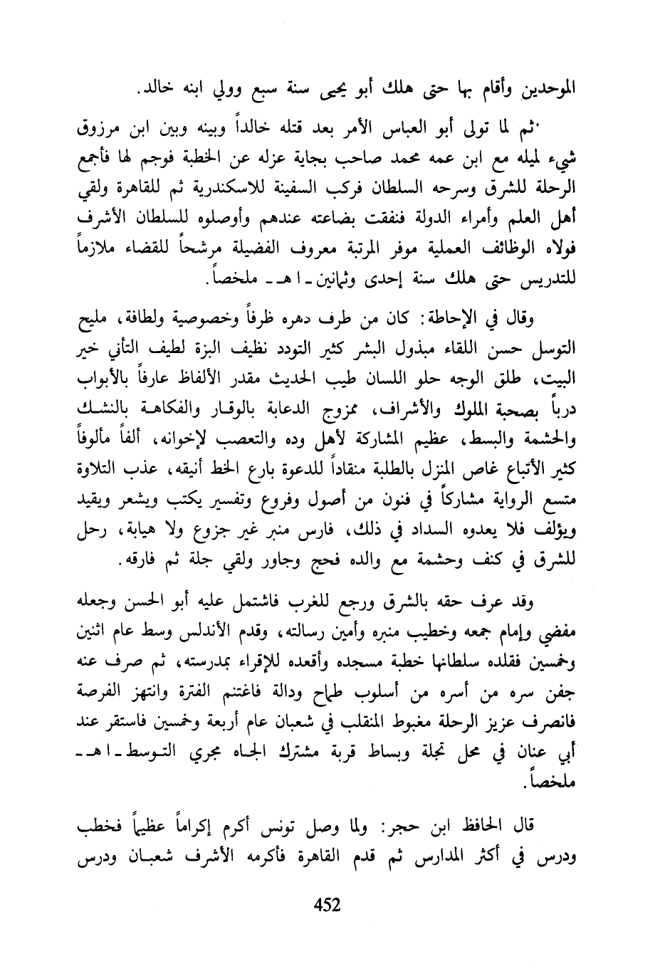 ثم لما تولى أبو العباس الأمر بعد قتله خالدًا وبينه وبين ابن مرزوق شيء لميله مع ابن عمه محمد صاحب بجاية عزله عن الخطبة فوجم لها فأجمع الرحلة للشرق وسرحه السلطان فركب السفينة للاسكندرية ثم للقاهرة ولقي أهل العلم وأمراء الدولة فنفقت بضاعته عندهم وأوصلوه للسلطان الأشرف فولاه الوظائف العملية موفر المرتبة معروف الفضيلة مرشحًا للقضاء ملازمًا للتدريس حتى هلك سنة إحدى وثمانين -اهـ- ملخصًا.
