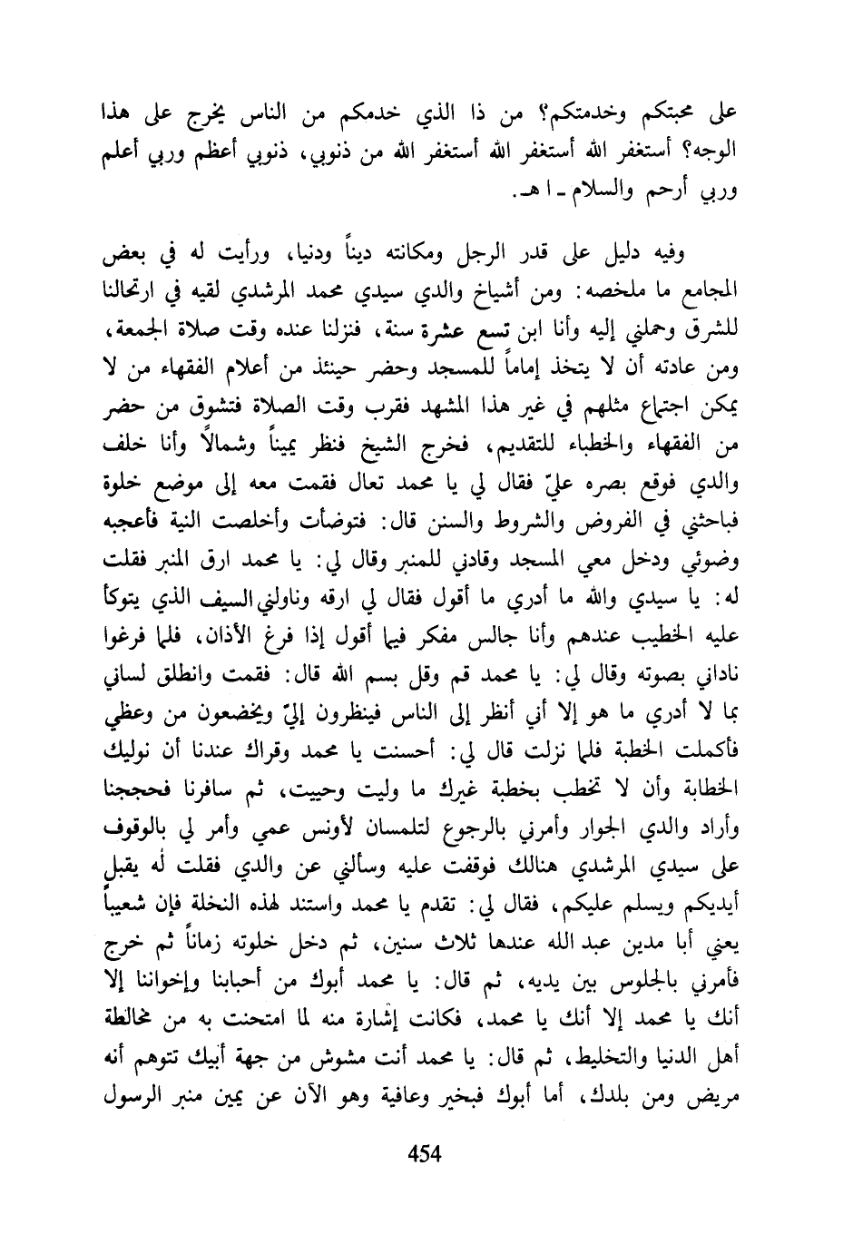 وفيه دليل على قدر الرجل ومكانته دينًا ودنيا، ورأيت له في بعض المجامع ما ملخصه: ومن أشياخ والدي سيدي محمد المرشدي لقيه في ارتحالنا للشرق وحملني إليه وأنا ابن تسع عشرة سنة، فنزلنا عنده وقت صلاة الجمعة، ومن عادته أن لا يتخذ إمامًا للمسجد وحضر حينئذ من أعلام الفقهاء من لا يمكن اجتماع مثلهم في غير هذا المشهد فقرب وقت الصلاة فتشوق من حضر من الفقهاء والخطباء للتقديم، فخرج الشيخ فنظر يمينًا وشمالًا وأنا خلف والدي فوقع بصره عليّ فقال لي يا محمد تعال فقمت معه إلى موضع خلوة فباحثني في الفروض والشروط والسنن قال: فتوضأت وأخلصت النية فأعجبه وضوئي ودخل معي المسجد وقادني للمنبر وقال لي: يا محمد ارق المنبر فقلت له: يا سيدي واللَّه ما أدري ما أقول فقال لي ارقه وناولني السيف الذي يتوكأ عليه الخطيب عندهم وأنا جالس مفكر فيما أقول إذا فرغ الأذان، فلما فرغوا ناداني بصوته وقال لي: يا محمد قم وقل بسم اللَّه قال: فقمت وانطلق لساني بما لا أدري ما هو إلا أني انظر إلى الناس فينظرون إليّ ويخضعون من وعظي فأكملت الخطبة فلما نزلت قال لي: أحسنت يا محمد وقراك عندنا أن نوليك الخطابة وأن لا تخطب بخطبة غيرك ما وليت وحييت، ثم سافرنا فحججنا وأراد والدي الجوار وأمرني بالرجوع لتلمسان لأونس عمي وأمر لي بالوقوف على سيدي المرشدي هنالك فوقفت عليه وسألني عن والدي فقلت له يقبل أيديكم ويسلم عليكم، فقال لي: تقدم يا محمد واستند لهذه النخلة فإن شعيبًا يعتي أبا مدين عبد اللَّه عندها ثلاث سنين، ثم دخل خلوته زمانًا ثم خرج فأمرني بالجلوس بين يديه، ثم قال: يا محمد أبوك من أحبابنا وإخواننا إلا أنك يا محمد إلا أنك يا محمد، فكانت إشارة منه لما امتحنت به من مخالطة أهل الدنيا والتخليط، ثم قال: يا محمد أنت مشوش من جهة أبيك تتوهم أنه مريض ومن بلدك، أما أبوك فبخير وعافية وهو الآن عن يمين منبر الرسول