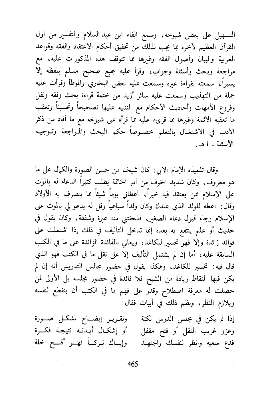 وقال تلميذه الإمام الابي: كان شيخنا من حسن الصورة والكمال على ما هو معروف، وكان شديد الخوف من أمر الخاتمة يطلب كثيرًا الدعاء له بالموت على الإسلام ممن يعتقد فيه خيرًا، أعطاني يومًا شيئًا مما يتصرف به الأولاد وقال: اعطه للولد الذي عندك وكان ولدًا سباعيًا وقل له يدعو لي بالموت على الإسلام رجاء قبول دعاء الصغير، فلحقتني منه عبرة وشفقة، وكان يقول في حديث أو علم ينتفع به بعده إنما تدخل التآليف في ذلك إذا اشتملت على فوائد زائدة وإلا فهو تخسير للكاغد، ويعاني بالفائدة الزائدة على ما في الكتب السابقة عليه، أما إن لم يشتمل التأليف إلا على نقل ما في الكتب فهو الذي قال فيه: تخسير للكاغد، وهكذا يقول في حضور مجالس التدريس أنه إن لم يكن فيها التقاط زيادة من الشيخ فلا فائدة في حضور مجلسه بل الأولى لمن حصلت له معرفة اصطلاح وقدر على فهم ما في الكتب أن ينقطع لنفسه ويلازم النظر، ونظم ذلك في أبيات فقال: