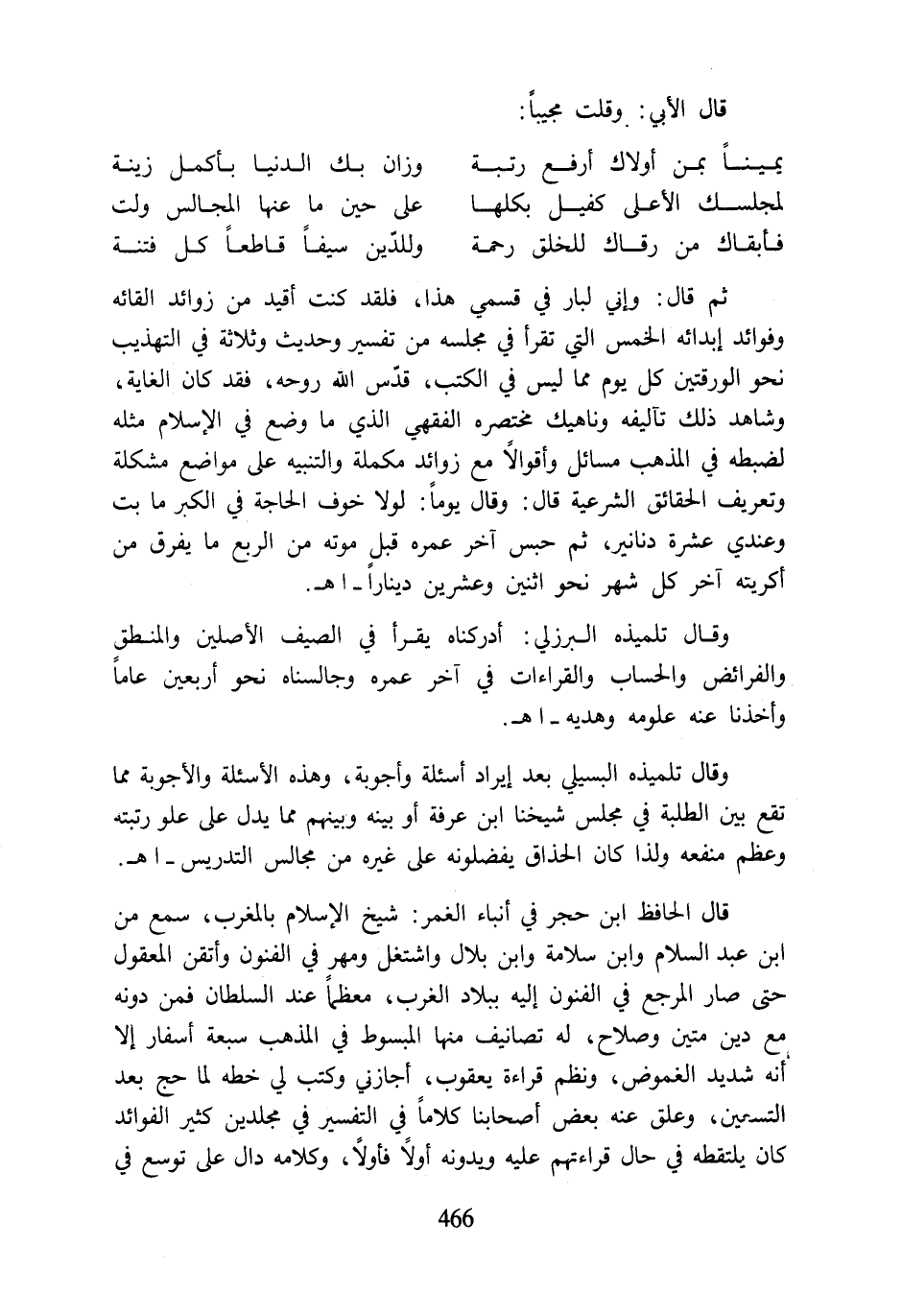 وقال تلميذه البرزلي: أدركناه يقرأ في الصيف الأصلين والمنطق والفرائض والحساب والقراءات في آخر عمره وجالسناه نحو أربعين عامًا وأخذنا عنه علومه وهديه- اهـ.