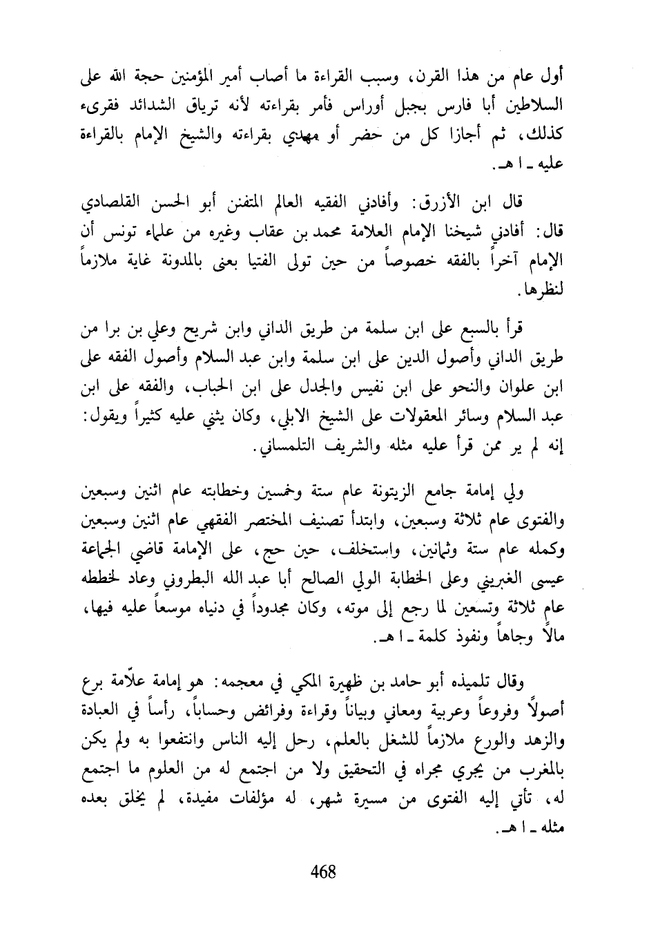 قال ابن الأزرق: وأفادني الفقيه العالم المتفنن أبو الحسن القلصادي قال: أفادني شيخنا الإمام العلامة محمد بن عقاب وغيره من علماء تونس أن الإمام آخرًا بالفقه خصوصًا من حين تولى الفتيا بعنى بالمدونة غاية ملازمًا لنظرها.