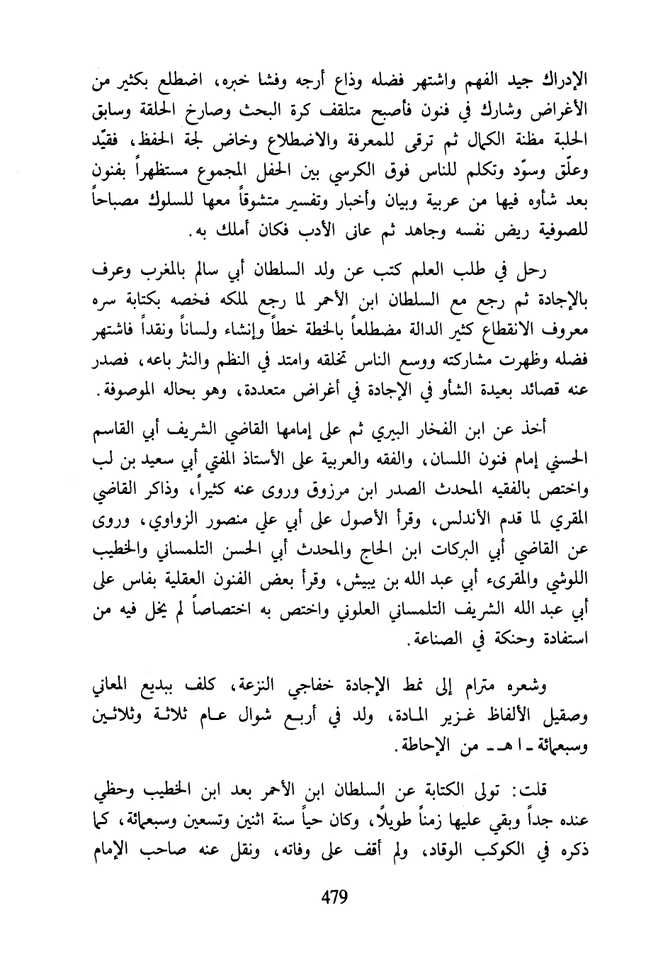قلت: تولى الكتابة عن السلطان ابن الأحمر بعد ابن الخطيب وحظي عنده جدًا وبقي عليها زمنًا طويلًا، وكان حيًا سنة اثنين وتسعين وسبعمائة، كما ذكره في الكوكب الوقاد، ولم أقف على وفاته، ونقل عنه صاحب الإمام