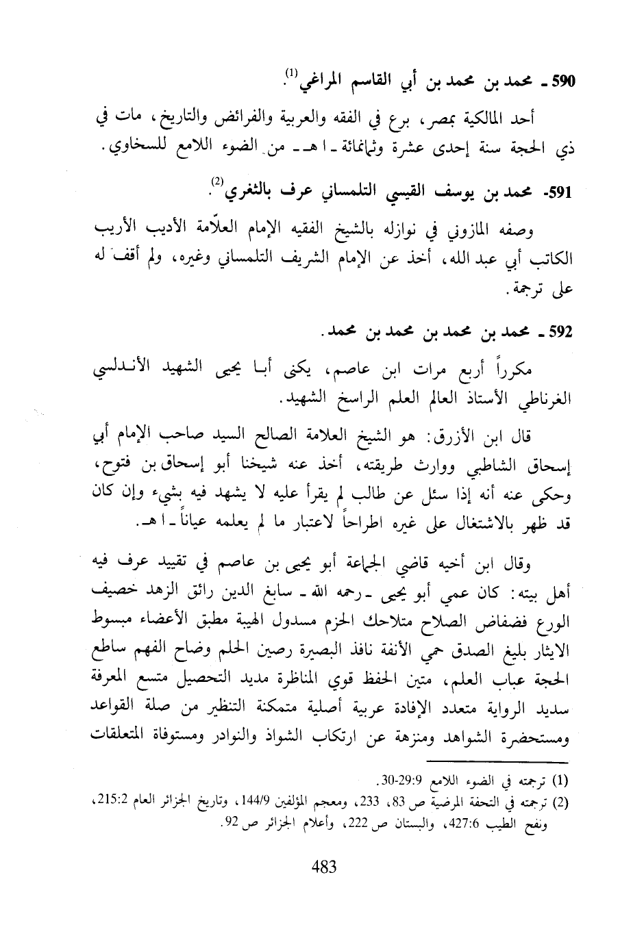 (¬2) ترجمته في التحفة المرضية ص 83، 233، ومعجم المؤلفين 9/ 144، وتاريخ الجزائر العام 2: 215، ونفح الطيب 6: 427، والبستان ص 222، وأعلام الجزائر ص 92.