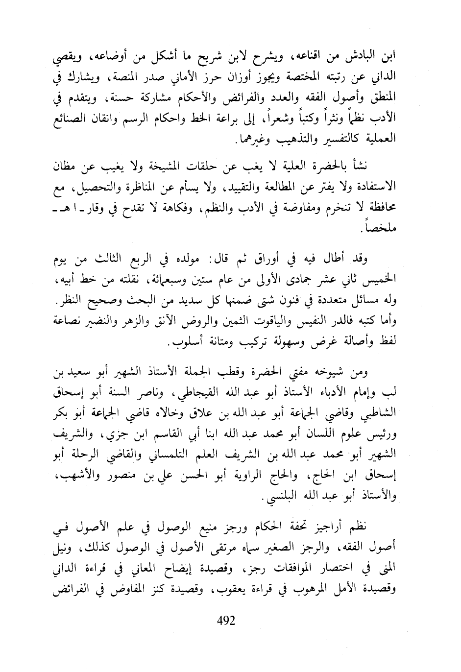ابن البادش من اقناعه، ويشرح لابن شريح ما أشكل من أوضاعه، ويقصي الداني عن رتبته المختصة ويجوز أوزان حرز الأماني صدر المنصة، ويشارك في المنطق وأصول الفقه والعدد والفرائض والأحكام مشاركة حسنة، ويتقدم في الأدب نظمًا ونثرًا وكتبًا وشعرًا، إلى براعة الخط واحكام الرسم وانقان الصنائع العملية كالتفسير والتذهيب وغيرهما.