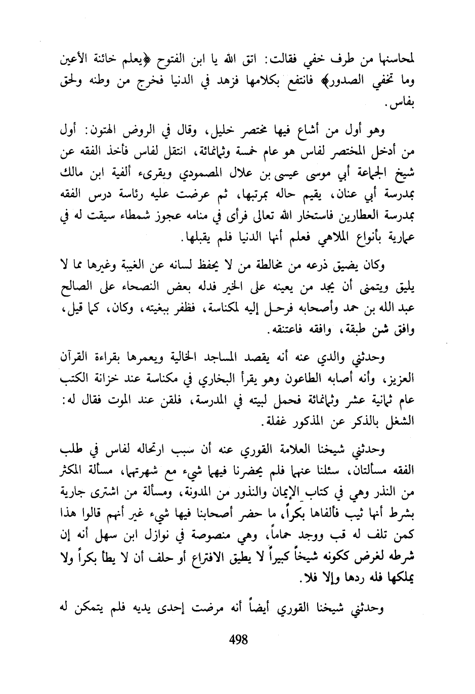 وحدثني شيخنا العلامة القوري عنه أن سبب ارتحاله لفاس في طلب الفقه مسألتان، سئلنا عنهما فلم يحضرنا فيهما شيء مع شهرتهما، مسألة المكثر من النذر وهي في كتاب الإيمان والنذور من المدونة، ومسألة من اشترى جارية بشرط أنها ثيب فألفاها بكرًا، ما حضر أصحابنا فيها شيء غير أنهم قالوا هذا كمن تلف له قب ووجد حمامًا، وهي منصوصة في نوازل ابن سهل أنه إن شرطه لغرض ككونه شيخًا كبيرًا لا يطيق الافتراع أو حلف أن لا يطأ بكرًا ولا يملكها فله ردها وإلا فلا.