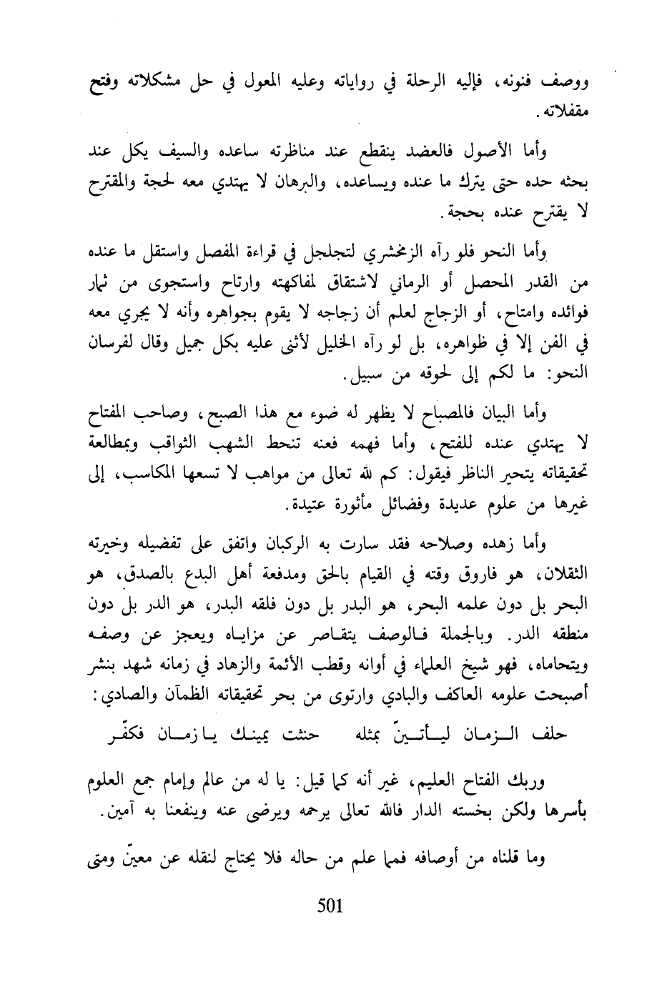 وأما النحو فلو رآه الزمخشري لتجلجل في قراءة المفصل واستقل ما عنده من القدر المحصل أو الرماني لاشتقاق لفاكهته وارتاح واستجوى من ثمار فوائده وامتاح، أو الزجاج لعلم أن زجاجه لا يقوم بجواهره وأنه لا يجري معه في الفن إلا في ظواهره، بل لو رآه الخليل لأثنى عليه بكل جميل وقال لفرسان النحو: ما لكم إلى لحوقه من سبيل.