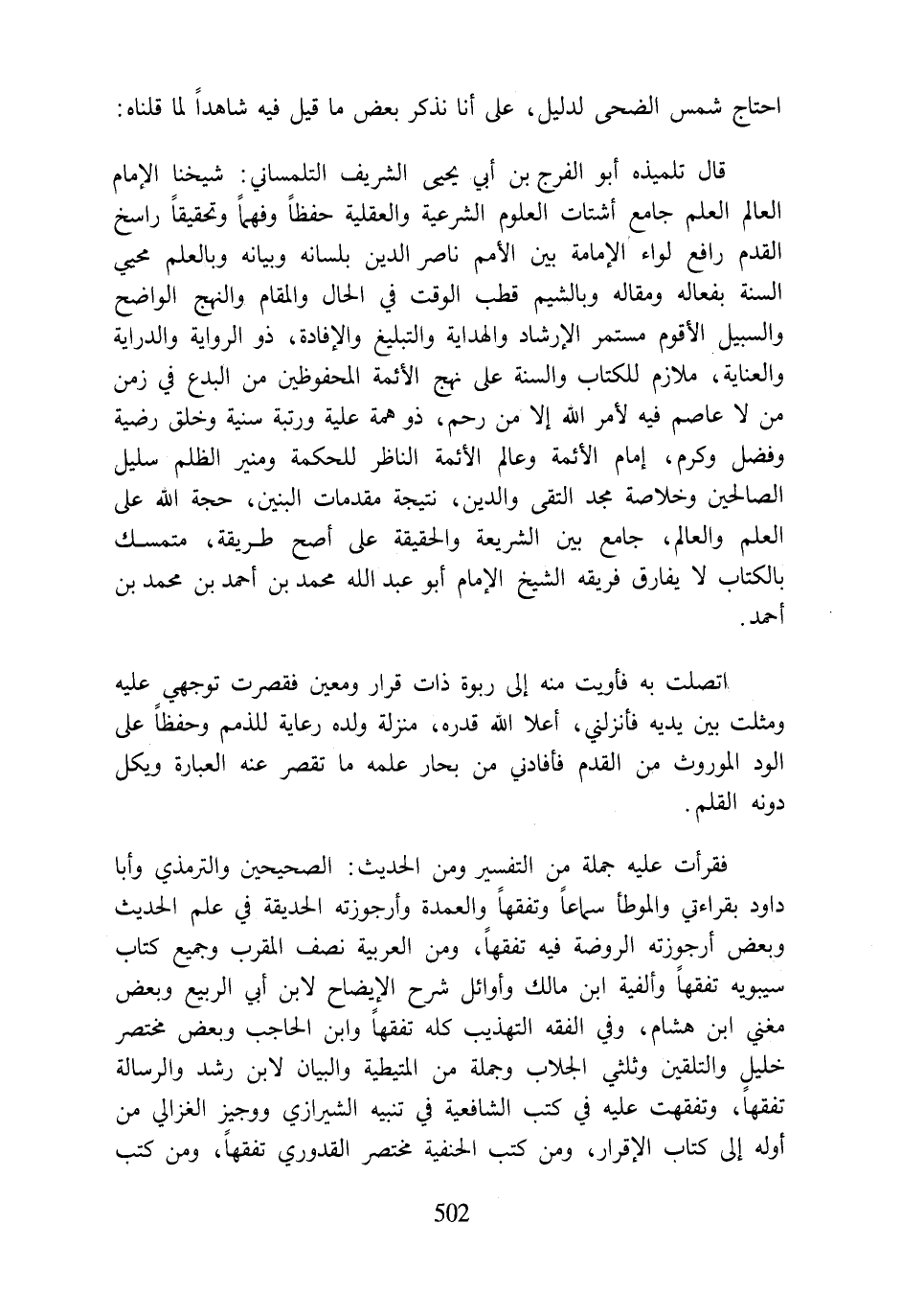 اتصلت به فأويت منه إلى ربوة ذات قرار ومعين فقصرت توجهي عليه ومثلت بين يديه فأنزلني، أعلا اللَّه قدره، منزلة ولده رعاية للذمم وحفظًا على الود الموروث من القدم فأفادني من بحار علمه ما تقصر عنه العبارة ويكل دونه القلم.