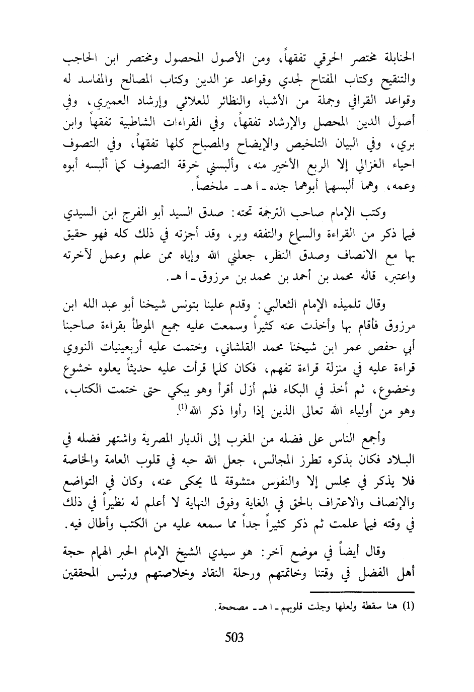 وقال أيضًا في موضع آخر: هو سيدي الشيخ الإمام الحبر الهمام حجة أهل الفضل قي وقتنا وخاتمتهم ورحلة النقاد وخلاصتهم ورئيس المحققين