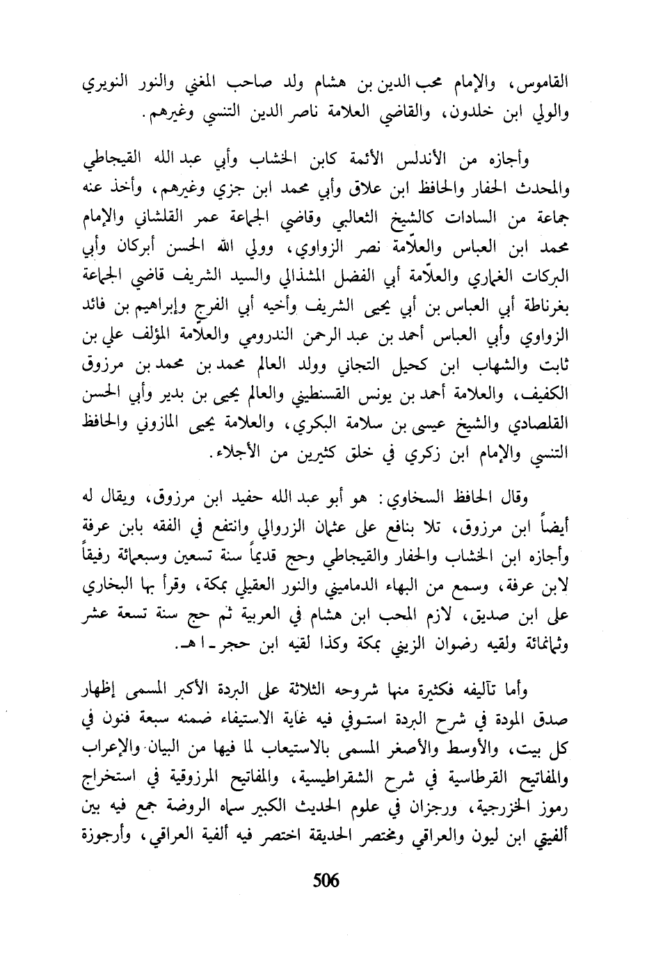 وقال الحافظ السخاوي: هو أبو عبد اللَّه حفيد ابن مرزوق، ويقال له أيضًا ابن مرزوق، تلا بنافع على عثمان الزروالي وانتفع في الفقه بابن عرفة وأجازه ابن الخشاب والحفار والقيجاطي وحج قديمًا سنة تسعين وسبعمائة رفيقًا لابن عرفة، وسمع من البهاء الدماميني والنور العقيلي بمكة، وقرأ بها البخاري على ابن صديق، لازم المحب ابن هشام في العربية ثم حج سنة تسعة عشر وثمانمائة ولقيه رضوان الزيني بمكة وكذا لقيه ابن حجر- اهـ.