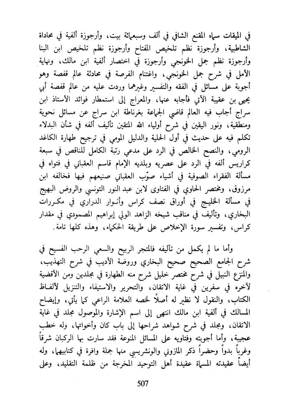 وأما ما لم يكمل من تآليفه فالمتجر الربيح والسعي الرحب الفسيح في شرح الجامع الصحيح صحيح البخاري وروضة الأديب في شرح التهذيب، والمنزع النبيل في شرح مختصر خليل شرح منه الطهارة في مجلدين ومن الأقضية لآخره في سفرين في غاية الاتقان، والتحرير والاستيفاء والتنزيل لألفاظ الكتاب، والنقول لا نظير له أصلًا لخصه العلامة الراعي كما يأتي، وايضاح المسالك في ألفية ابن مالك انتهى إلى اسم الإشارة والموصول مجلد في غاية الاتقان، ومجلد في شرح شواهد شراحها إلى باب كان وأخواتها، وله خطب عجيبة، وأما أجوبته وفتاويه على المسائل المنوعة فقد سارت بها الركبان شرقًا وغربًا بدوًا وحضرًا ذكر المازوني والونشريسي منها جملة وافرة في كتابيهما، وله أيضًا عقيدته المسماة عقيدة أهل التوحيد المخرجة من ظلمة التقليد، وعلى