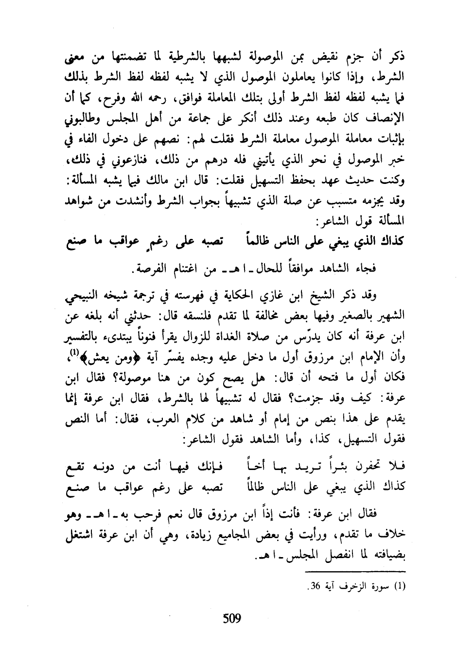 وقد ذكر الشيخ ابن غازي الحكاية في فهرسته في ترجمة شيخه النبيحي الشهير بالصغير وفيها بعض مخالفة لما تقدم فلنسقه قال: حدثني أنه بلغه عن ابن عرفة أنه كان يدزّس من صلاة الغداة للزوال يقرأ فنونًا يبتدئ بالتفسير وأن الإمام ابن مرزوق أول ما دخل عليه وجده يفسِّر آية {وَمَنْ يَعْشُ} (¬1)، فكان أول ما فتحه أن قال: هل يصح كون من هنا موصولة؟ فقال ابن عرفة: كيف وقد جزمت؟ فقال له تشبيهًا لها بالشرط، فقال ابن عرفة إنما يقدم على هذا بنص من إمام أو شاهد من كلام العرب، فقال: أما النص فقول التسهيل، كذا، وأما الشاهد فقول الشاعر: