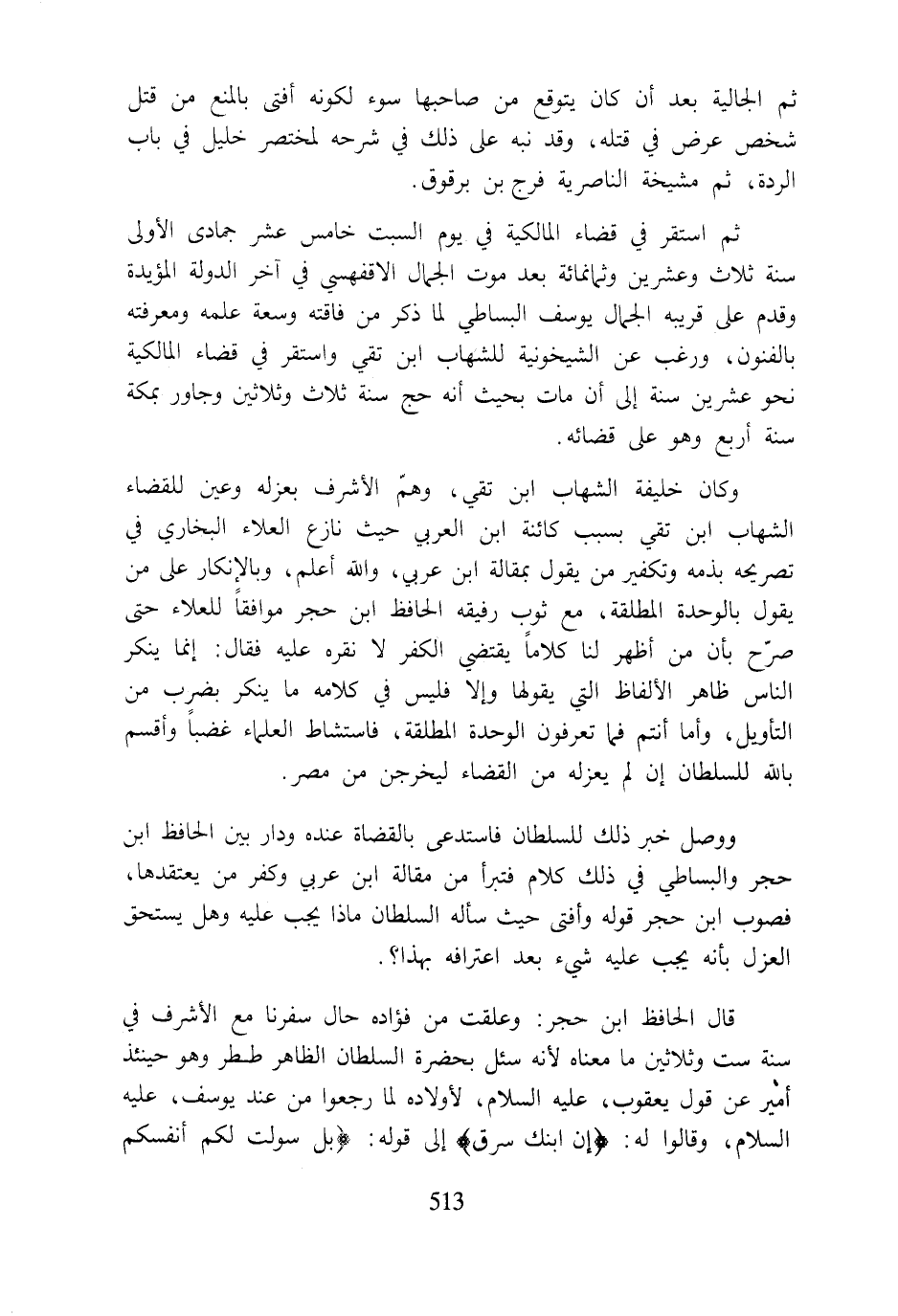 ووصل خبر ذلك للسلطان فاستدعى بالقضاة عنده ودار بين الحافظ ابن حجر والبساطي في ذلك كلام فتبرأ من مقالة ابن عربي وكفر من يعتقدها، فصوب ابن حجر قوله وأفتى حيث سأله السلطان ماذا يجب عليه وهل يستحق العزل بأنه يجب عليه شيء بعد اعترافه بهذا؟.