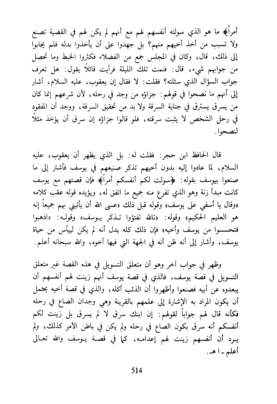 فال الحافظ ابن حجر: فقلت له: بل الذي يظهر أن يعقوب، عليه السلام، لما عادوا إليه بدون أخيهم تذكر صنيعهِم في يوسف فأشار إلى ما صنعوا بيوسف بقوله: {سَوَّلَتْ لَكُمْ أَنْفُسُكُمْ أَمْرًا} فإن قصتهم مع يوسف كانت مبدأ زنة وهو الذي تفرع منه جميع ما اتفق له، ويؤيده قوله عقب كلامه "وقال يا أسفي على يوسف" وقوله قبل ذلك {عَسَى اللَّهُ أَنْ يَأْتِيَنِي بِهِمْ جَمِيعًا إِنَّهُ هُوَ الْعَلِيمُ الْحَكِيمُ} وقوله: {تَاللَّهِ تَفْتَأُ تَذْكُرُ يُوسُفَ} وقوله: {اذْهَبُوا فَتَحَسَّسُوا مِنْ يُوسُفَ وَأَخِيهِ} فإن ذلك كله يدل أنه لم يكن لييأس من حياة يوسف، وأشار إلى أنه ظن أنه في الجهة التي فيها أخوه، واللَّه سبحانه أعلم.