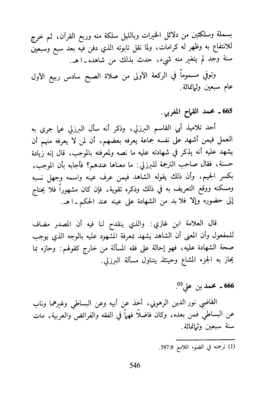 أحمد تلاميذ أبي القاسم البرزلي، وذكر أنه سأل البرزلي عما جرى به العمل فيمن أشهد على نفسه جماعة يعرفه بعضهم، أن لمن لا يعرفه منهم أن يشهد عليه أنه يذكر في شهادته عليه ما نصه ولمعرفته بالموجب، قال إنه زيادة حسنة، فقال صاحب الترجمة للبرزلي: ما معناها عندهم؟ فأجابه بأن الموجب، بكسر الجيم، وأن ذلك يقوله الشاهد فيمن عرف عينه واسمه وجهل نسبه ومسكنه ووقع التعريف به في ذلك وذكره تقوية، فإن كان مشهورًا فلا يحتاج إلى حضوره وإلا فلابد من الشهادة على عينه عند الحكم- اهـ.