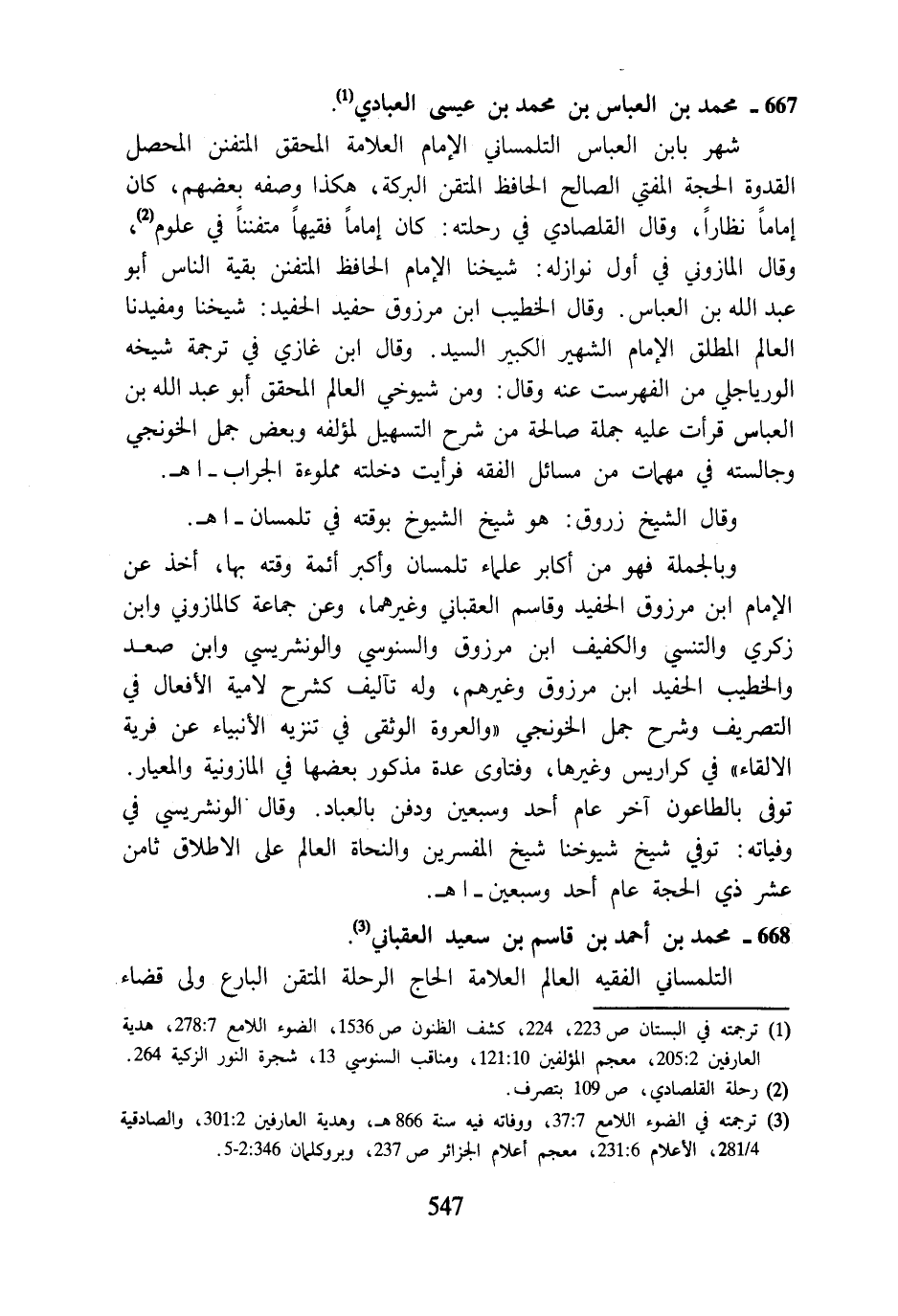 (¬3) ترجمته في الضوء اللامع 7: 37، ووفاته فيه سنة 866 هـ، وهدية العارفين 2: 301، والصادقية 4: 281، الأعلام 6: 231، معجم أعلام الجزائر ص 237، وبروكلمان 346: 2 - 5.