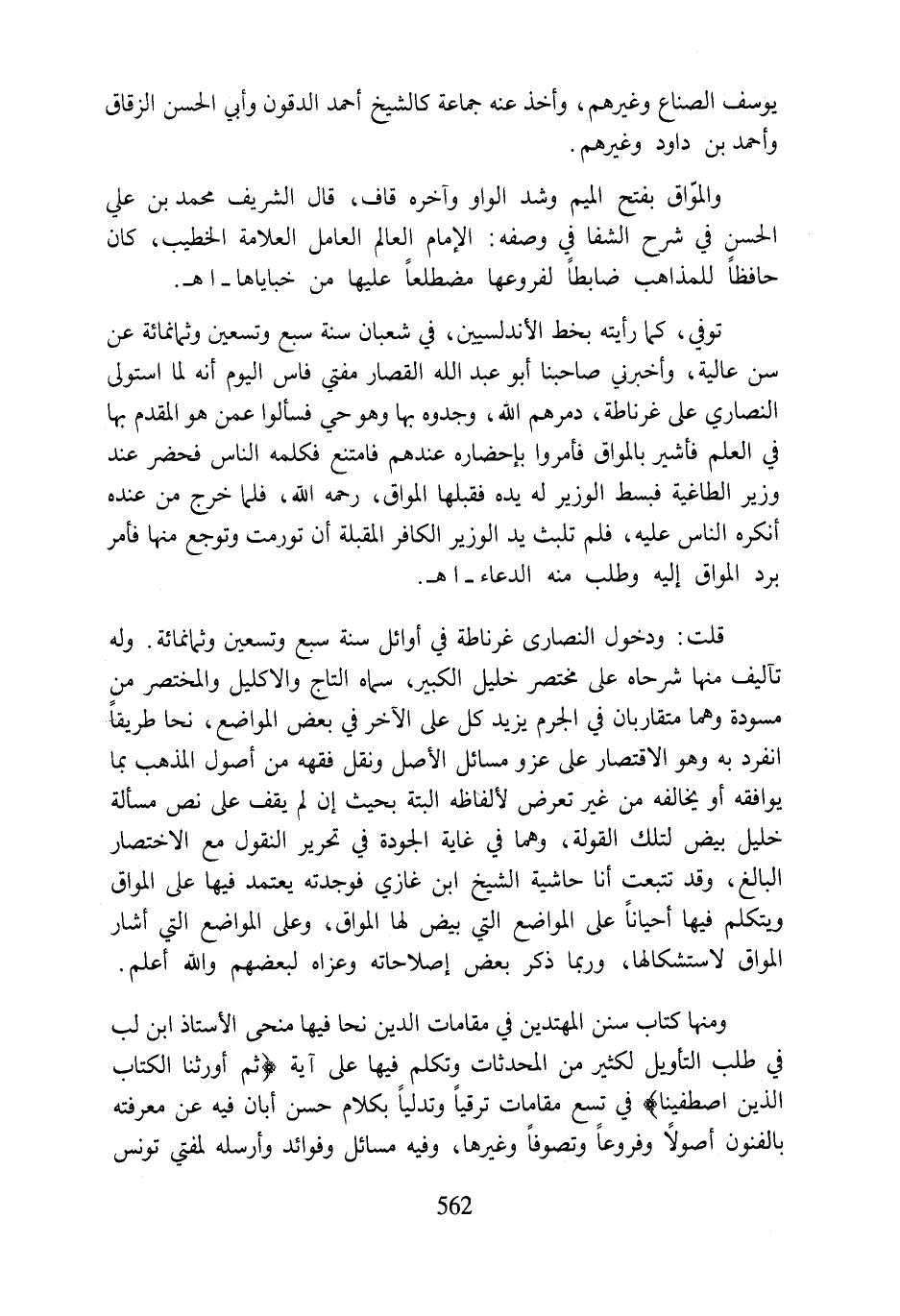 توفي، كما رأيته بخط الأندلسيين، في شعبان سنة سبع وتسعين وثمانمائة عن سن عالية، وأخبرني صاحبنا أبو عبد اللَّه القصار مفتي فاس اليوم أنه لما استولى النصاري على غرناطة، دمرهم اللَّه، وجدوه بها وهو حي فسألوا عمن هو المقدم بها في العلم فأشير بالمواق فأمروا بإحضاره عندهم فامتنع فكلمه الناس فحضر عند وزير الطاغية فبسط الوزير له يده فقبلها المواق، رحمه اللَّه، فلما خرج من عنده أنكره الناس عليه، فلم تلبث يد الوزير الكافر المقبلة أن تورمت وتوجع منها فأمر برد المواق إليه وطلب منه الدعاء- اهـ.