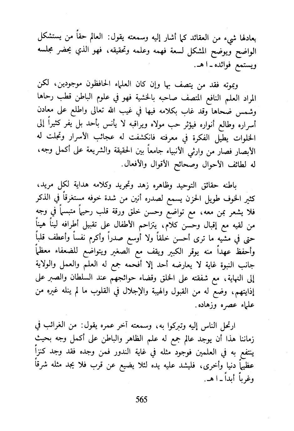 وبموته فقد من يتصف بها وإن كان العلماء الحافظون موجودين، لكن المراد العلم النافع المتصف صاحبه بالخشية فهو في علوم الباطن قطب رحاها وشمس ضحاها وقد غاب بكلامه فيها في غيب اللَّه تعالى واطلع على معادن أسراره وطالع أنواره فيؤثر حب مولاه ويراقبه لا يأنس بأحد بل يفر كثيرًا إلى الخلوات يطيل الفكرة في معرفته فانكشفت له عجائب الأسرار وتجلت له الأبصار فصار من وارثي الأنبياء جامعًا بين الحقيقة والشريعة على أكمل وجه، له لطائف الأحوال وصحائح الأقوال والأفعال.