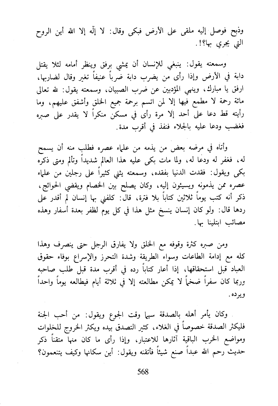 ومن صبره كثرة وقوفه مع الخلق ولا يفارق الرجل حتى ينصرف وهذا كله مع إدامة الطاعات وسواء الطريقة وشدة التحرز والإسراع بوفاء حقوق العباد قبل استحقاقها، إذا أعار كتابًا رده في أقرب مدة قبل طلب صاحبه وربما كان سفرًا ضخمًا لا يمكن مطالعته إلا في ثلاثة أيام فيطالعه يومًا واحدًا ويرده.