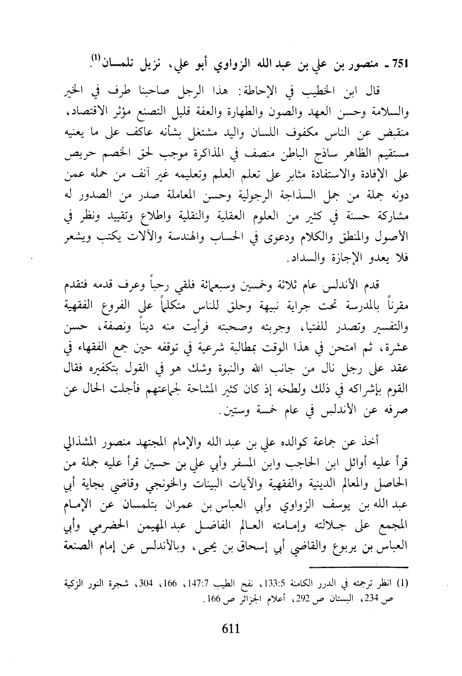 751 - منصور بن علي بن عبد اللَّه الزواوي أبو علي، نزيل تلمسان (¬1).