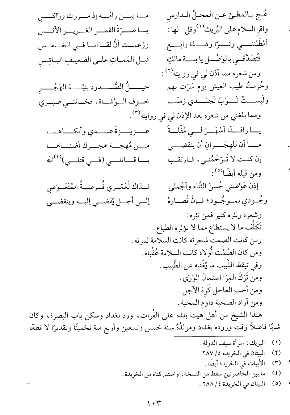 وَمَنْ أَرَادَ الصُّحْبَةَ دَاوَمَ الْمَحَبَّةَ هَذَا الشَّيْخُ مِنْ أَهْلِ هِيتَ، بَلْدَةٍ عَلَى الْفُرَاتِ، وَرَدَ بَغْدَادَ وَسَكَنَ بَابَ الْبَصْرَةِ، وَكَانَ شَابًّا فَاضِلا وَقْتَ وُرُودِهِ بَغْدَادَ، وَمَوْلِدُهُ سَنَةَ خَمْسٍ وَتِسْعِينَ وَأَرْبَعِ مِائَةٍ، تَخْمِينًا وَتَقْدِيرًا، لا قَطْعًا