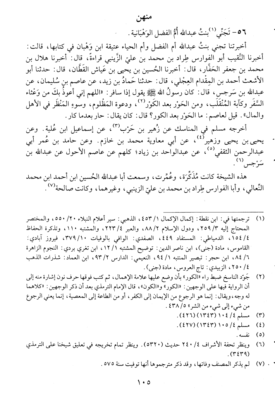 أَخْبَرَتْنَا تَجَنِّي بِنْتُ عَبْدِ اللَّهِ أُمُّ الْفَضْلِ وَأُمُّ الْحَيَاءِ عَتِيقَةُ بِنْتِ وَهْبَانَ فِي كِتَابِهَا، قَالَتْ: أَخْبَرَنَا النَّقِيبُ أَبُو الْفَوَارِسِ طَرَّادُ بْنُ مُحَمَّدِ بْنِ عَلِيٍّ الزَّيْنَبِيُّ، قِرَاءَةً، أَخْبَرَنَا هِلالُ بْنُ مُحَمَّدِ بْنِ جَعْفَرٍ الْحَفَّارُ، أَخْبَرَنَا الْحُسَيْنُ بْنُ يَحْيَى بْنِ عَيَّاشٍ الْقَطَّانُ، حَدَّثَنَا أَبُو الأَشْعَثِ أَحْمَدُ بْنُ الْمِقْدَامِ الْعِجْلِيُّ، حَدَّثَنَا حَمَّادُ بْنُ زَيْدٍ، عَنْ عَاصِمِ بْنِ سُلَيْمَانَ، عَنْ عَبْدِ اللَّهِ بْنِ سَرْجِسٍ، قَالَ: كَانَ رَسُولُ اللَّهِ صَلَّى اللَّهُ عَلَيْهِ وَسَلَّمَ، يَقُولُ إِذَا سَافَرَ: «اللَّهُمَّ إِنِّي أَعُوذُ بِكَ مِنْ وَعْثَاءِ السَّفَرِ، وَكَآبَةِ الْمُنْقَلَبِ، وَمِنَ الْحَوْرِ بَعْدَ الْكَوْرِ، وَدَعْوَةِ الْمَظْلُومِ، وَسُوءِ الْمَنْظَرِ فِي الأَهْلِ وَالْمَالِ» ، قِيلَ لِعَاصِمٍ: مَا الْحَوْرُ بَعْدَ الْكَوْرِ؟ قَالَ: كَانَ يُقَالُ: حَارَ بَعْدَ مَا كَارَ.