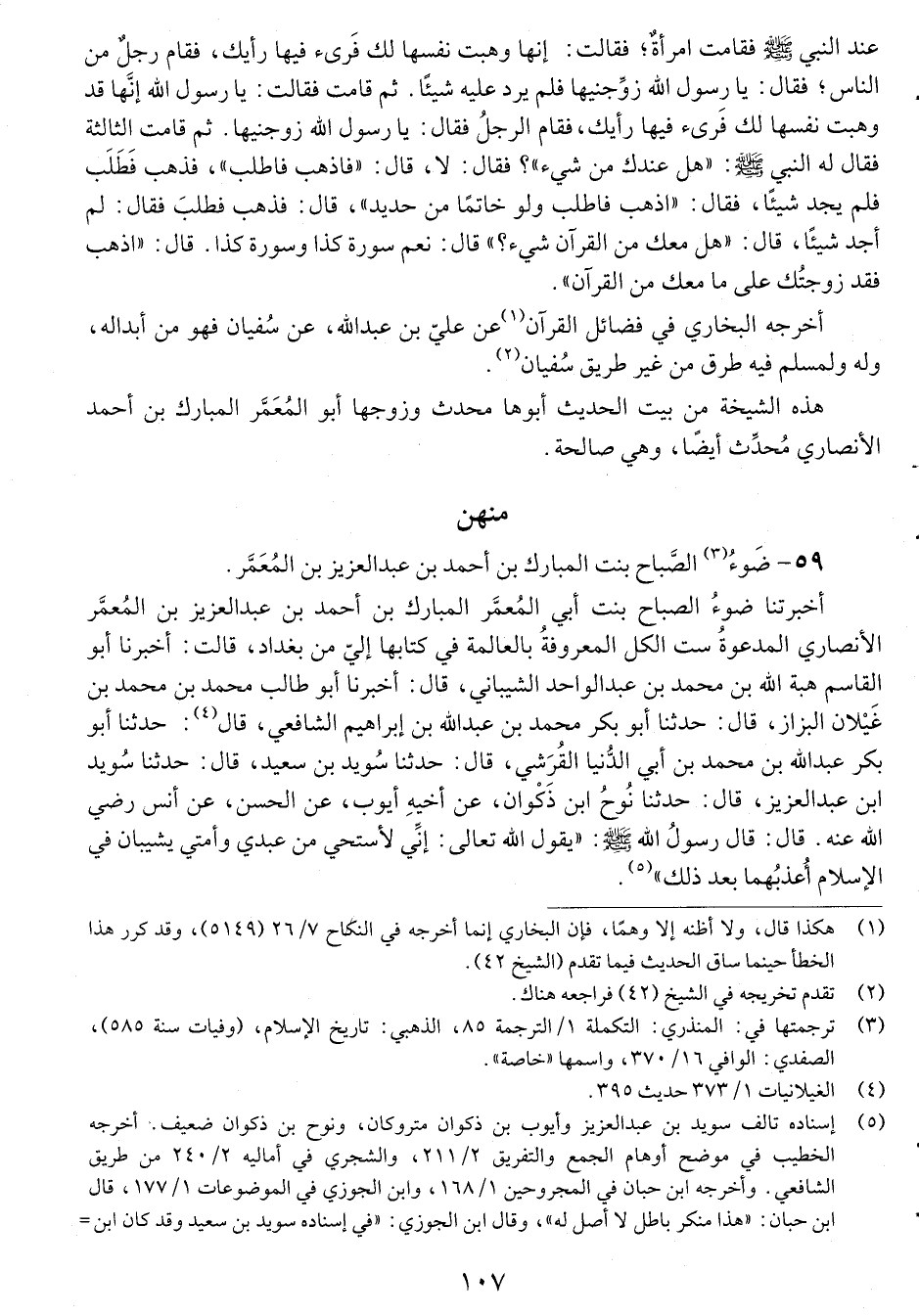 عِنْدَ النَّبِيِّ صَلَّى اللَّهُ عَلَيْهِ وَسَلَّمَ، فَقَامَتِ امْرَأَةٌ، فَقَالَتْ: إِنَّهَا وَهَبَتْ نَفْسَهَا لَكَ، فَرَ فِيهَا رَأْيَكَ، فَقَامَ رَجُلٌ مِنَ النَّاسِ، فَقَالَ: يَا رَسُولَ اللَّهِ زَوِّجْنِيهَا، فَلَمْ يَرُدَّ عَلَيْهِ شَيْئًا، ثُمَّ قَامَتْ فَقَالَتْ: يَا رَسُولَ اللَّهِ، إِنَّهَا قَدْ وَهَبَتْ نَفْسَهَا لَكَ فَرَأْ فِيهَا رَأْيَكَ، فَقَامَ الرَّجُلُ، فَقَالَ: يَا رَسُولَ اللَّهِ: زَوِّجْنِيهَا، ثُمَّ قَامَتِ الثَّالِثَةَ، فَقَالَ لَهُ النَّبِيُّ صَلَّى اللَّهُ عَلَيْهِ وَسَلَّمَ: هَلْ عِنْدَكَ مِنْ شَيْءٍ؟ قَالَ: لا، قَالَ: فَاذْهَبْ فَاطْلُبْ، فَذَهَبَ فَطَلَبَ، فَلَمْ يَجِدْ شَيْئًا، ثُمَّ قَالَ: اذْهَبْ فَاطْلُبْ وَلَوْ خَاتَمًا مِنْ حَدِيدٍ، قَالَ: فَذَهَبَ فَطَلَبَ، فَقَالَ: لَمْ أَجِدْ شَيْئًا، قَالَ: هَلْ مَعَكَ مِنَ الْقُرْآنِ شَيْءٌ؟ قَالَ: سُورَةُ كَذَا وَكَذَا، قَالَ: اذْهَبْ فَقَدْ زَوَّجْتُكَ عَلَى مَا مَعَكَ مِنَ الْقُرْآنِ، أَخْرَجَهُ الْبُخَارِيُّ فِي (فَضَائِلِ الْقُرْآنِ) ، عَنْ عَلِيِّ بْنِ عَبْدِ اللَّهِ، سُفْيَانَ، فَهُوَ مِنْ أَبْدَالِهِ.
