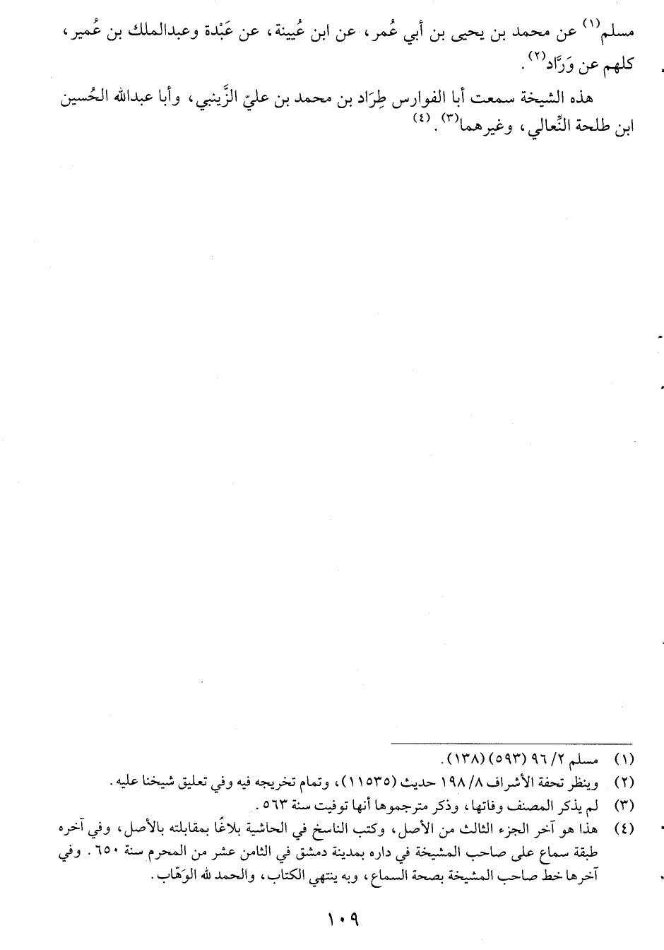 مُسْلِمٌ عَنْ مُحَمَّدِ بْنِ يَحْيَى بْنِ أَبِي عُمَرَ، عَنِ ابْنِ عُيَيْنَةَ، عَنْ عَبْدَةَ، وَعَبْدِ الْمَلِكِ بْنِ عُمَيْرٍ، كُلِّهِمْ عَنْ وَرَّادٍ