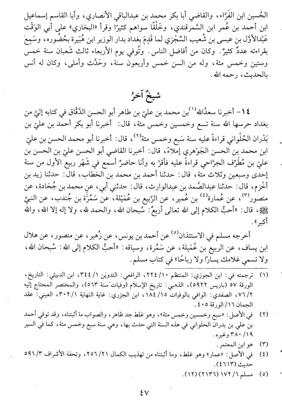 14 - أَخْبَرَنَا سَعْدُ اللَّهِ بْنُ مُحَمَّدِ بْنِ عَلِيِّ بْنِ طَاهِرٍ أَبُو الْحَسَنِ الدَّقَّاقُ، فِي كِتَابِهِ إِلَيَّ مِنْ بَغْدَادَ، حَرَسَهَا اللَّهُ، سَنَةَ تِسْعٍ وَخَمْسِينَ وَخَمْسِ مِائَةٍ، أَخْبَرَنَا أَبُو بَكْرٍ أَحْمَدُ بْنُ عَلِيِّ بْنِ بَدْرَانَ الْحُلْوَانِيُّ، قِرَاءَةً عَلَيْهِ، سَنَةَ سَبْعٍ وَخَمْسِينَ وَخَمْسِ مِائَةٍ، أَخْبَرَنَا أَبُو مُحَمَّدٍ الْحَسَنُ بْنُ عَلِيِّ بْنِ مُحَمَّدِ بْنِ الْحَسَنِ الْجَوْهَرِيُّ إِمْلاءً، أَخْبَرَنَا الْقَاضِي أَبُو الْحَسَنِ عَلِيُّ بْنُ الْحَسَنِ بْنِ عَلِيِّ بْنِ مُطَرِّفٍ الْجَرَّاحِيُّ، قِرَاءَةً عَلَيْهِ، فَأَقَرَّ عَلَيْهِ، فَأَمَرَ بِهِ، وَأَنَا حَاضِرٌ أَسْمَعُ، فِي شَهْرِ رَبِيعٍ الأَوَّلِ مِنْ سَنَةِ إِحْدَى وَسَبْعِينَ وَثَلاثِ مِائَةٍ، حَدَّثَنَا أَحْمَدُ بْنُ مُحَمَّدِ بْنِ الْخَطَّابِ، حَدَّثَنَا زَيْدُ بْنُ أَخْزَمَ، حَدَّثَنَا عَبْدُ الصَّمَدِ بْنُ عَبْدِ الْوَارِثِ، حَدَّثَنِي أَبِي، عَنْ مُحَمَّدِ بْنِ جُحَادَةَ، عَنْ مَنْصُورٍ، عَنْ عُمَارَةَ بْنِ عُمَيْرٍ، عَنِ الرَّبِيعِ بْنِ عُمَيْلَةَ، عَنْ سَمُرَةَ بْنِ جُنْدَبٍ: عَنِ النَّبِيِّ صَلَّى اللَّهُ عَلَيْهِ وَسَلَّمَ، قَالَ: " أَحَبُّ الْكَلامِ إِلَى اللَّهِ تَعَالَى أَرْبَعٌ: سُبْحَانَ اللَّهِ، وَالْحَمْدُ لِلَّهِ، وَلا إِلَهَ إِلا اللَّهُ، وَاللَّهُ أَكْبَرُ "، أَخْرَجَهُ مُسْلِمٌ فِي (الاسْتِئْذَانِ) ، عَنْ أَحْمَدَ بْنِ يُونُسَ، عَنْ زُهَيْرٍ، عَنْ مَنْصُورٍ، عَنْ هِلالِ بْنِ يَسَافٍ، عَنِ الرَّبِيعِ بْنِ عُمَيْلَةَ، عَنْ سَمُرَةَ، وَسِيَاقُهُ: " أَحَبُّ الْكَلامِ إِلَى اللَّهِ: سُبْحَانَ اللَّهِ، وَلا تُسَمِّ غُلامَكَ يَسَارًا، وَلا رَبَاحًا ".
